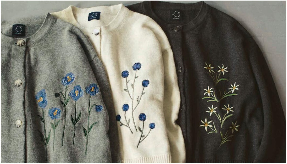 実際に六甲高山植物園内に植栽している人気の植物、「ヒマラヤの青いケシ」、「ヒゴタイ」、「エーデルワイス」をモチーフに、el:ment[エル:メント]と一緒に企画した、綿混カーディガン、シルク混ハンドウォーマーの2種を、11月中旬より、六甲高山植物園内ショップアルピコラにて販売開始予定です。