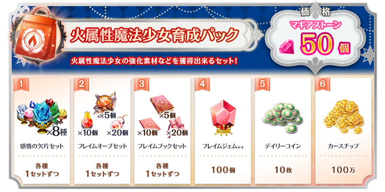 有償マギアストーンで購入できる「火属性魔法少女育成パック(有償)」には以下のアイテムが封入されています。