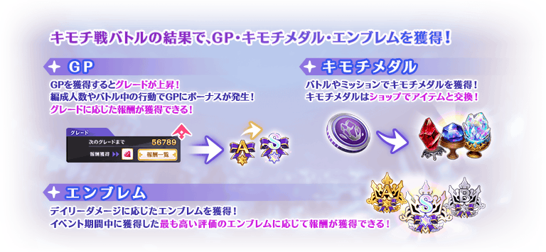 獲得した「エンブレム」が高位になるほど豪華報酬が獲得でき、「GP」が高いほど「キモチメダル」を多く獲得できます。「キモチメダル」はイベント限定ショップで「感情の欠片++」や「レインボーオーブ」等の貴重なアイテムと交換できます。
