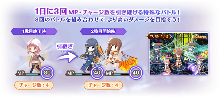 挑戦回数を消費するバトルにて獲得したCharge Combo数やMPを引き継いで挑戦できます。
