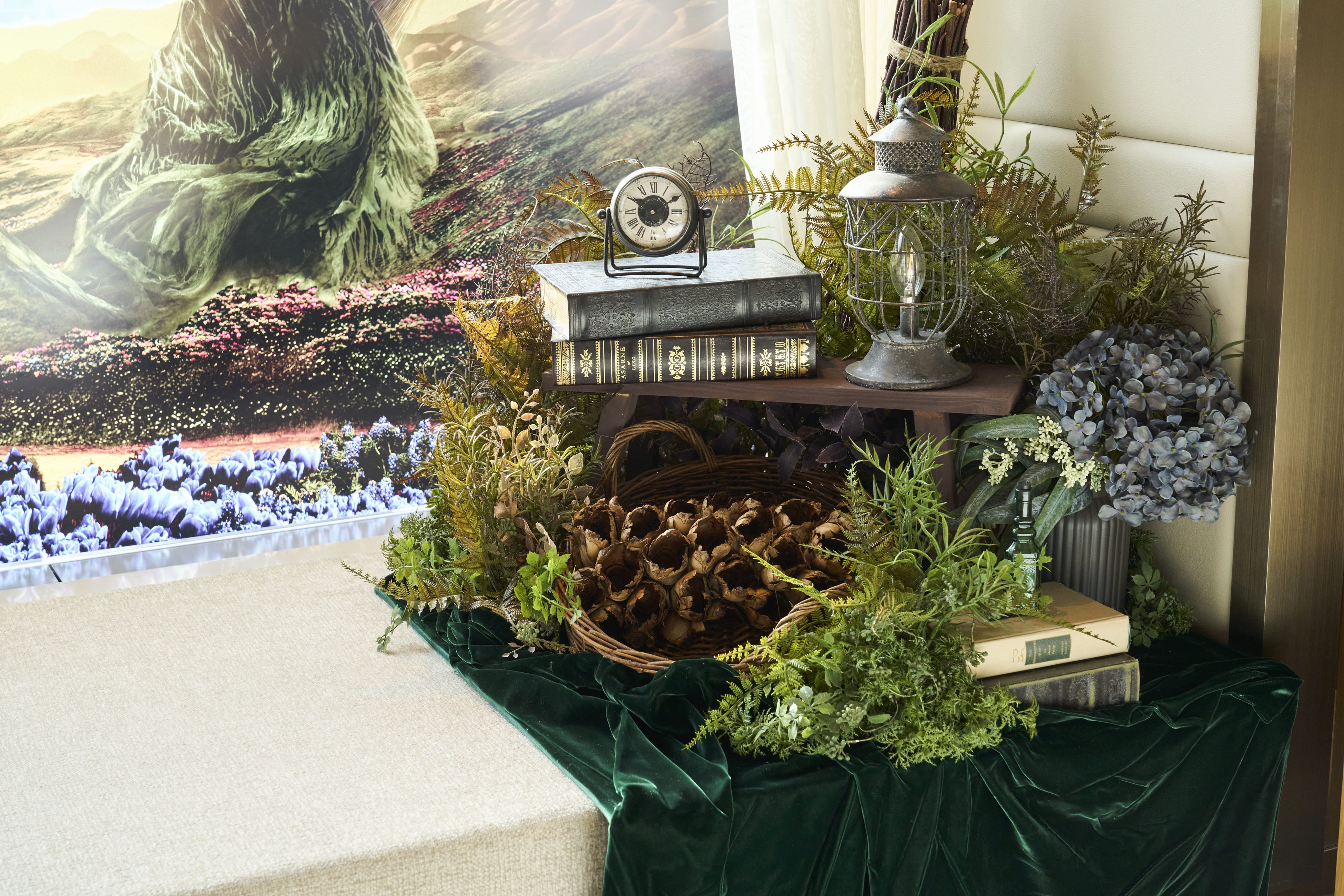 エルファバは、深い森で過ごすイメージで草木やキーアイテムであるほうきやエメラルドの小瓶、帽子などをご用意。