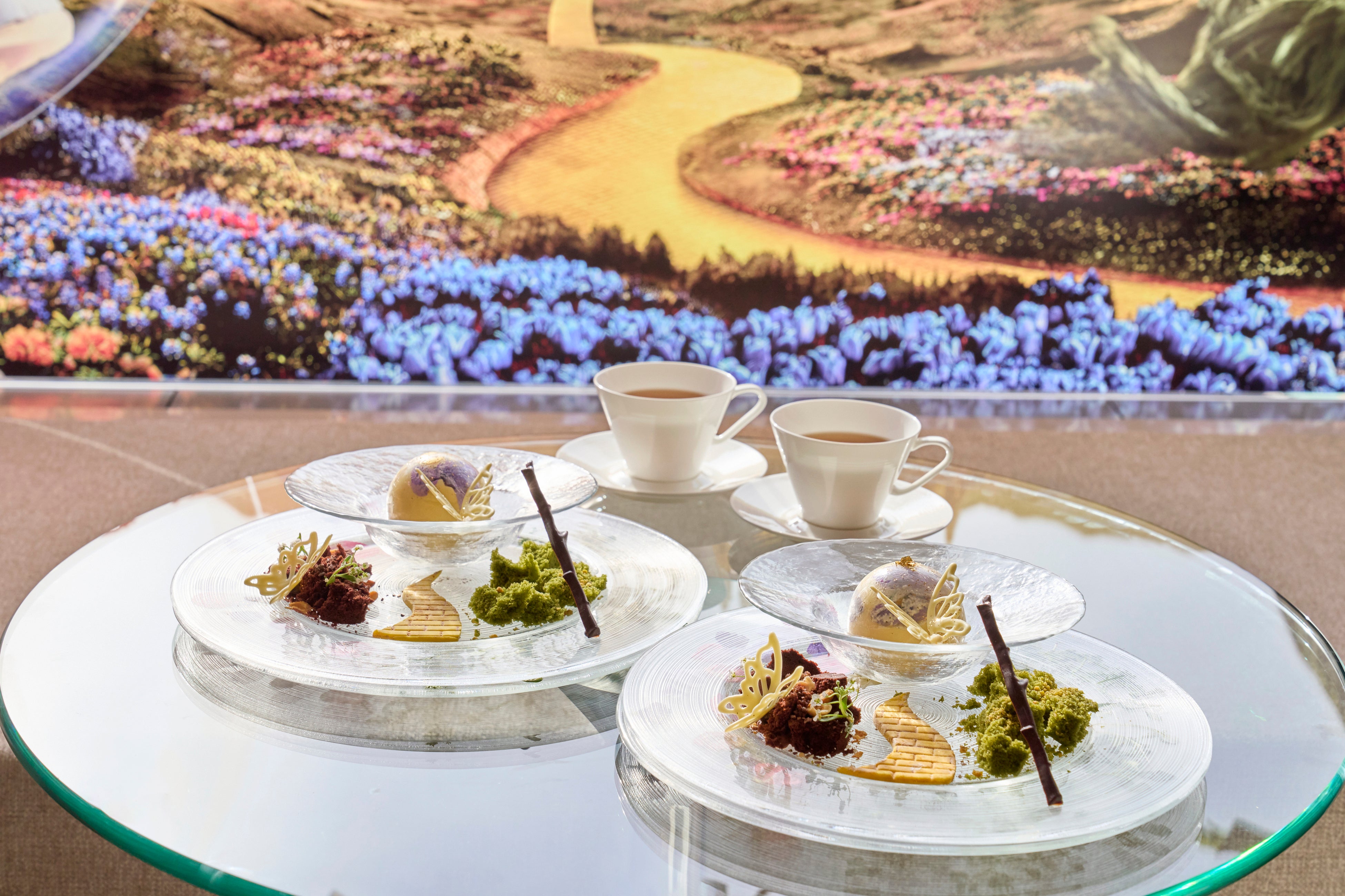 映画『ウィキッド 永遠の約束』に登場するエルファバとグリンダを表現したスイーツプレート。抹茶とピスタチオで仕上げたエルファバをイメージしたケーキ、グリンダのバブルをモチーフにした丸い飴細工にマスカルポーネクリームを絞ったスイーツ、そしてチョコレート製のイエローブリックロードをご用意いたしました。窓の外に広がる東京の絶景と、ふたりの魔女をイメージした客室で、「スペシャル映像」とともにスイーツをお楽しみいただけます。