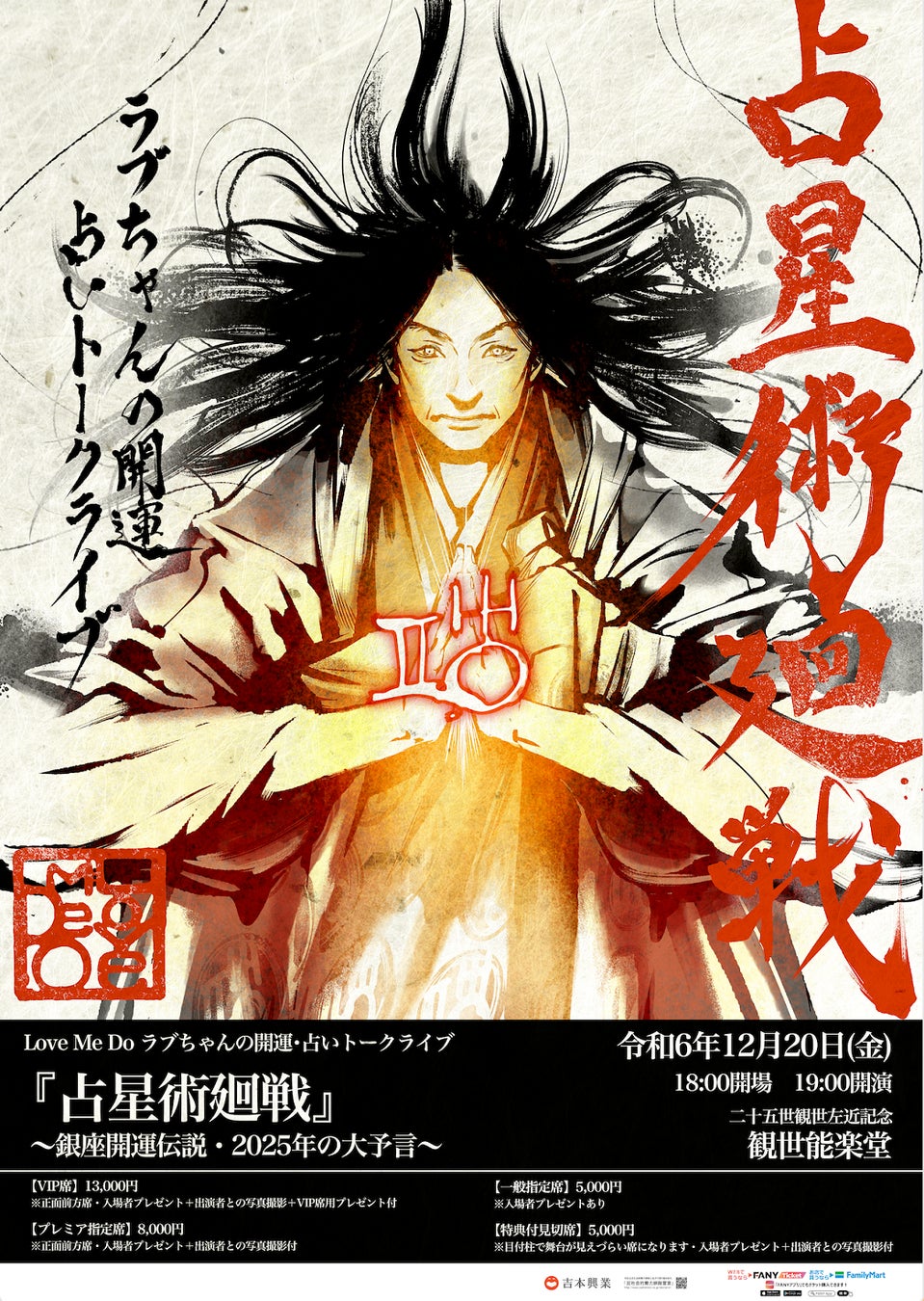 Love Me Doによるトークライブ「Love Me Do ラブちゃんの開運・占いトークライブ『占星術廻戦』~銀座開運伝説・2025年の大予言~」が2024年12月20日(金)に二十五世観世左近記念観世能楽堂で開催することが決定しました。
