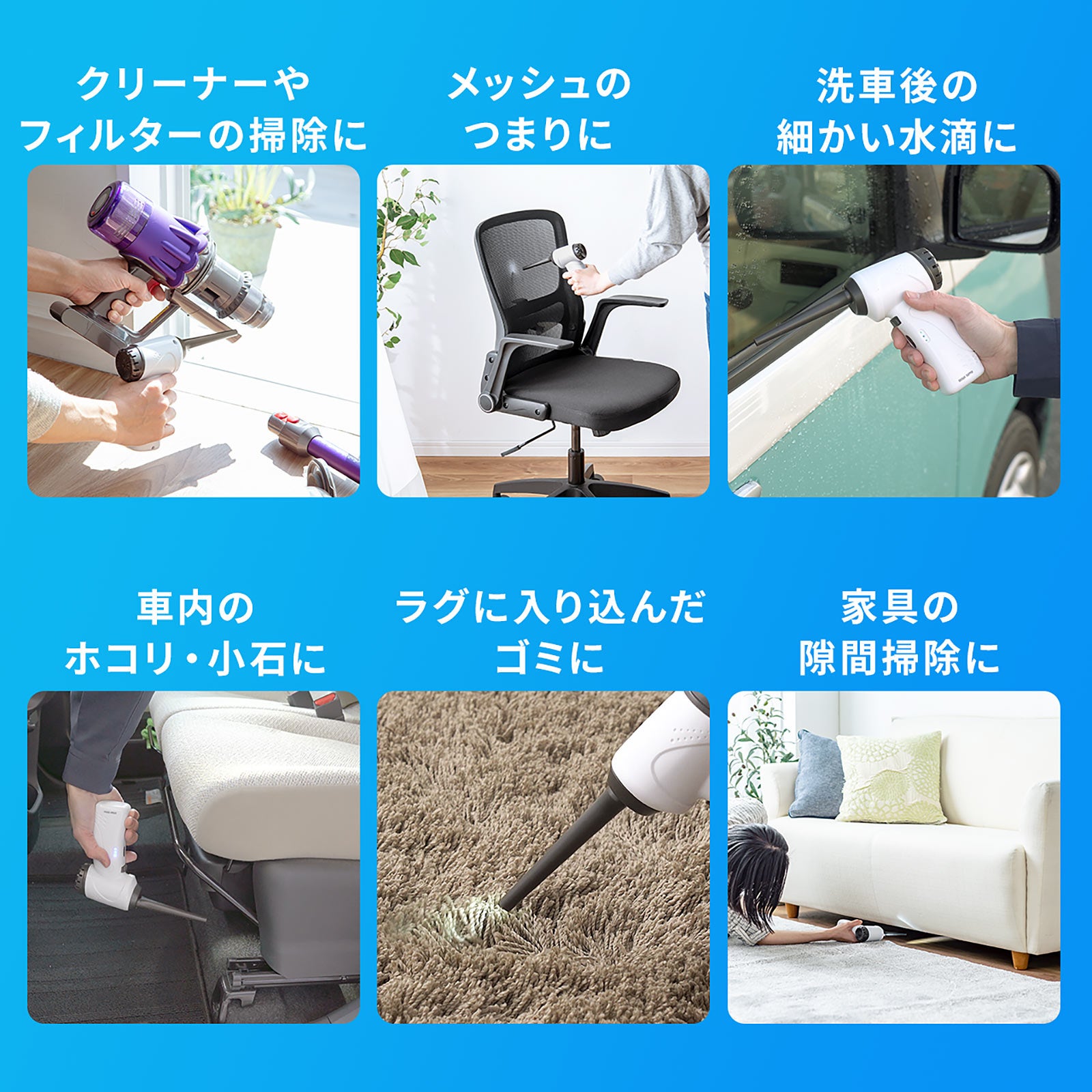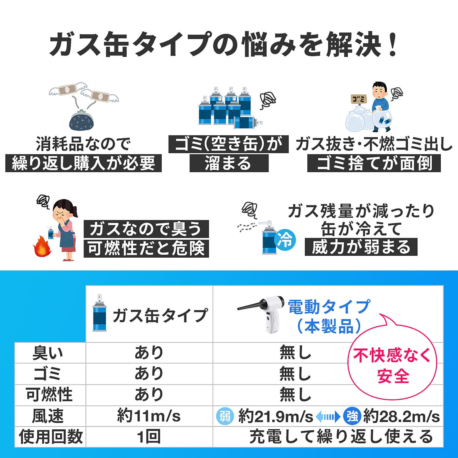 本製品は、充電式で繰り返し使える強力な電動エアダスターです。