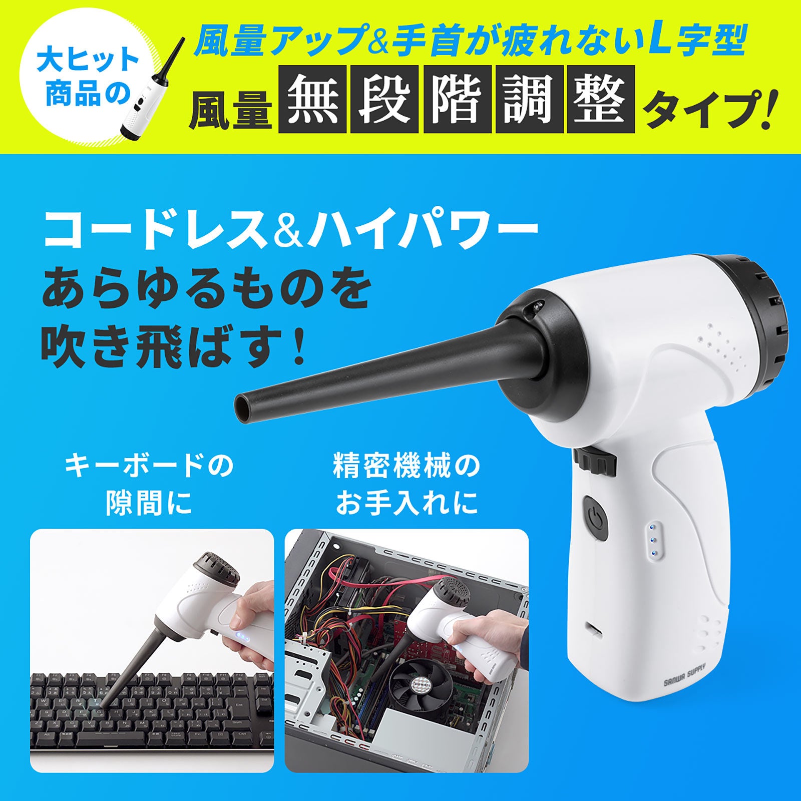 サンワサプライ株式会社(本社:岡山市北区田町1-10-1、 代表取締役社長 山田 和範)が運営している直販サイト『サンワダイレクト』では、充電式で強力噴射ができ、風量を手元のダイヤルで微調整可能な、電動エアダスター「200-CD071」を発売しました。