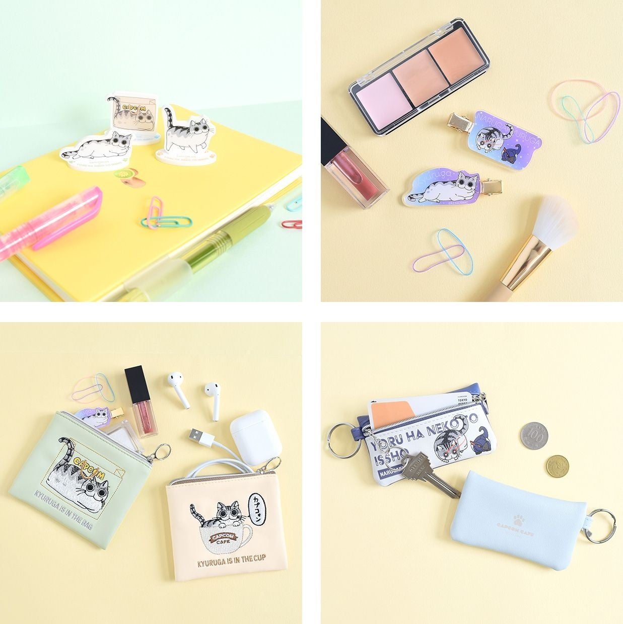 「アクリルスタンド」はミニサイズなので、デスクなどにさりげなくキュルガを飾ることができます◎ またコスメやガジェット小物などを収納するのにぴったりな「フラットポーチ」は今人気の“刺繍”仕上げ! キュルガの毛並みが艶やかに表現されています。