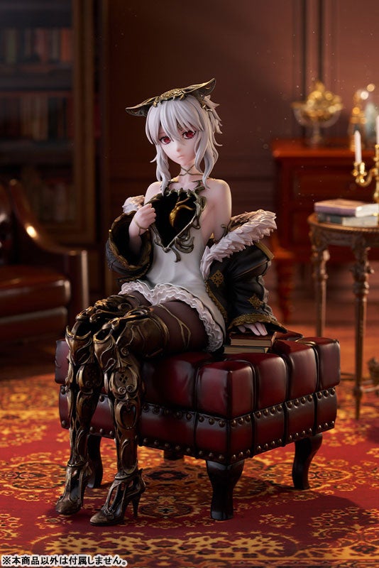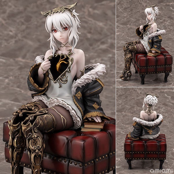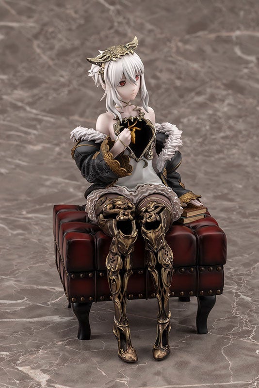 本を片手にリラックスして座る姿を立体化しました。台座はアンティークなスツールで、ゲームの世界観も感じられる豪華な仕様です。