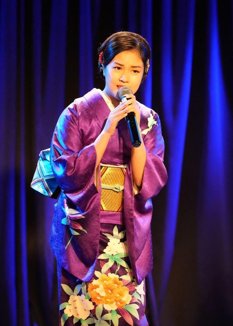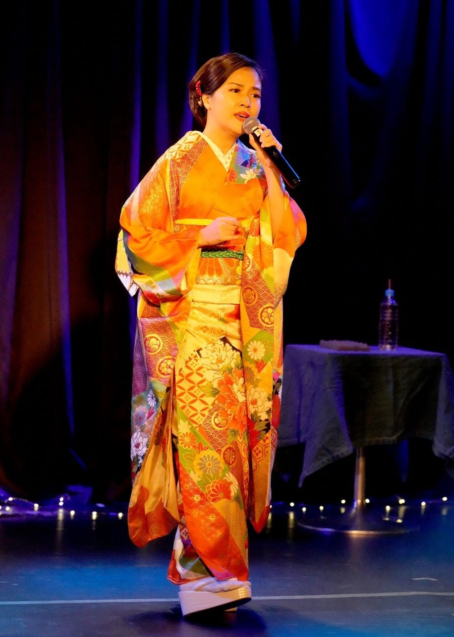オリジナル曲「あいたか橋」をはじめ、冬にちなんだ名曲から都はるみの「北の宿」、新沼謙治の「津軽恋女」、赤穂浪士討ち入りをテーマにしたオリジナル曲「男安兵衛喧嘩華」、エジプトで自身のスマホで撮影してきた写真をスライドで紹介しながら一部、アラビア語を交えながらオリジナル曲「愛しゃ愛しゃ」、エジプトでも人気の