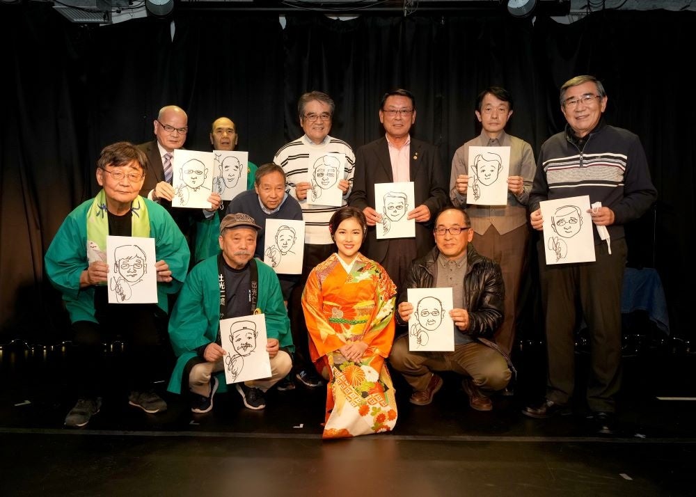 出光仁美が描いた似顔絵を持つ10人のファンと出光仁美(中央)