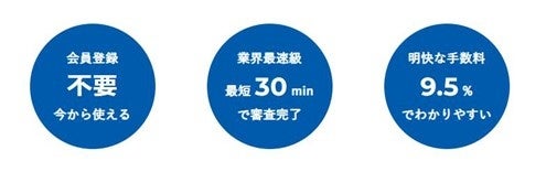 利用にあたっての会員登録は不要で、入金前の請求書があれば申し込みできることに加え、最短30分で請求書の買取審査が完了します。手数料は一律9.5%で、審査が完了していれば、申込当日中の着金も可能となります。