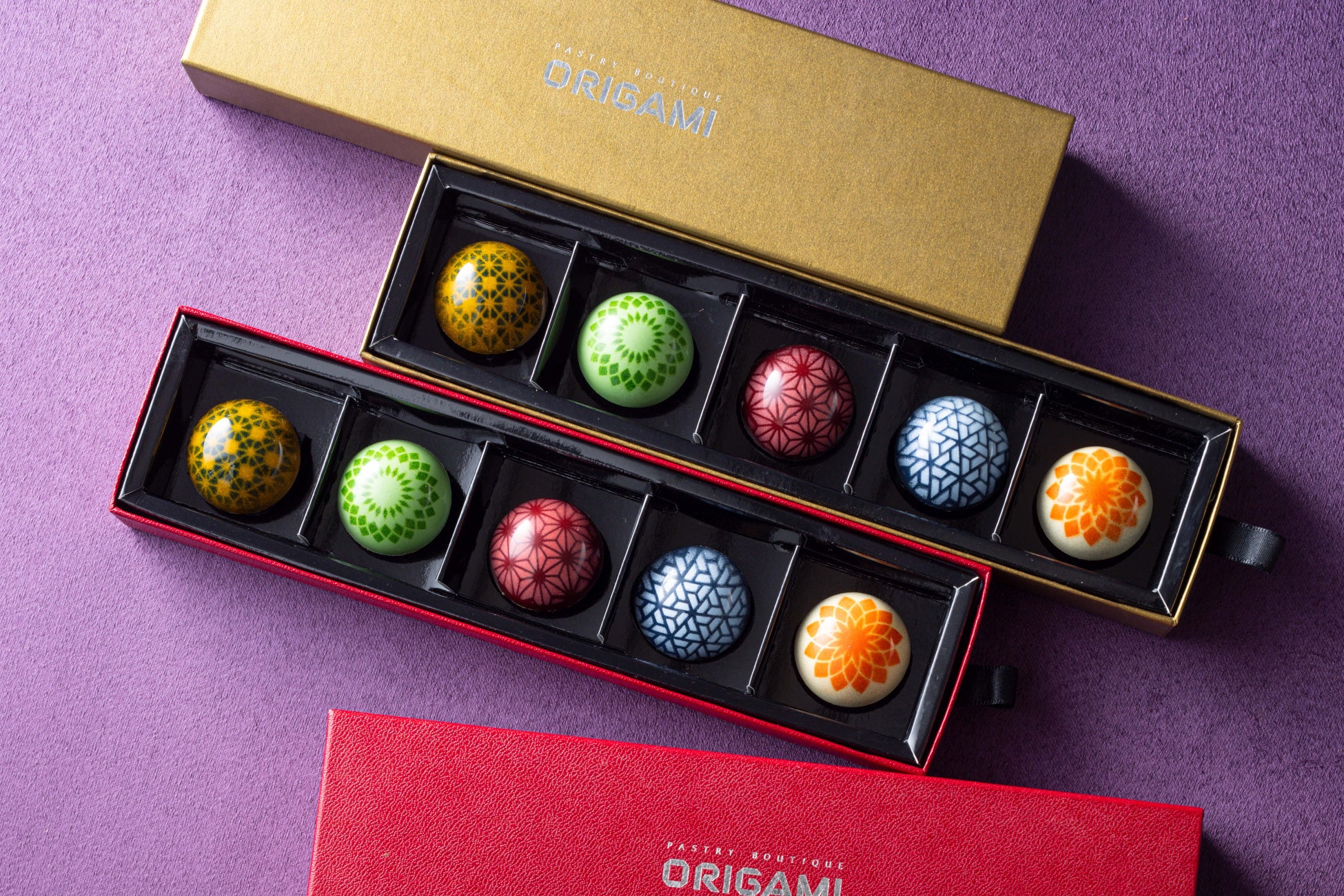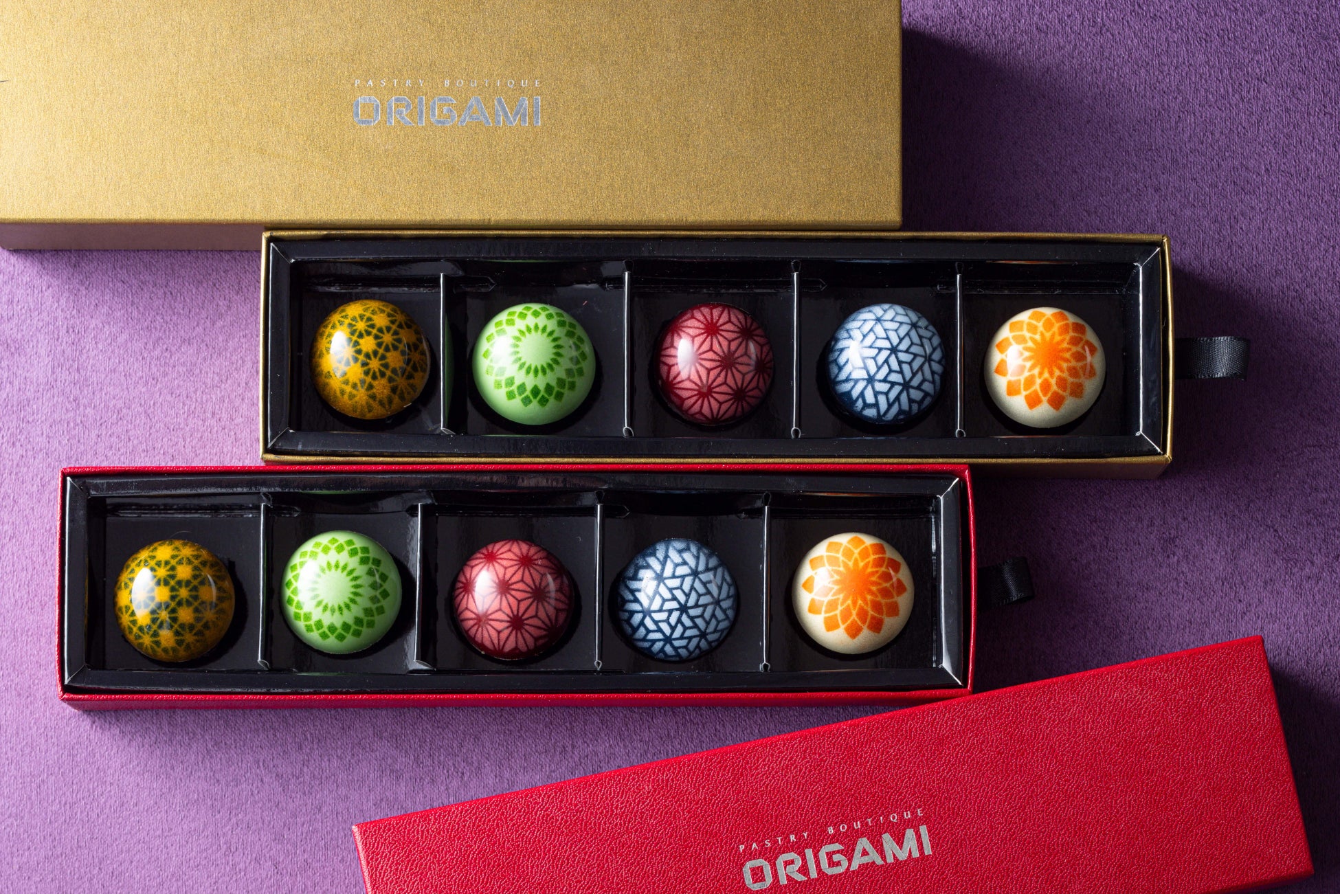 手毬をモチーフにした愛らしいボンボンショコラ。5種類のフルーツ(林檎、ライム、パイナップル、グレープフルーツ、ベリー)をベースに、絶妙なスパイスのアクセントを加え、それぞれの風味をビターチョコレートで包み込みました。繊細な和柄は、シェフパティシエが一つひとつ丁寧に仕上げたオリジナルデザイン。カカオの深い余韻と果実の鮮やかな酸味が織りなす、贅沢なハーモニーをお楽しみください。