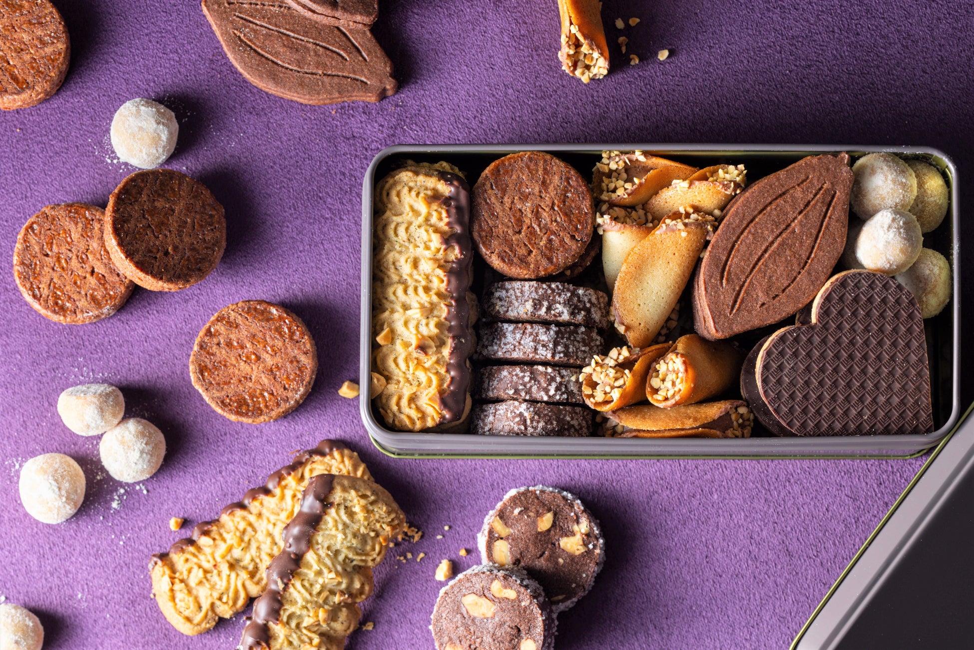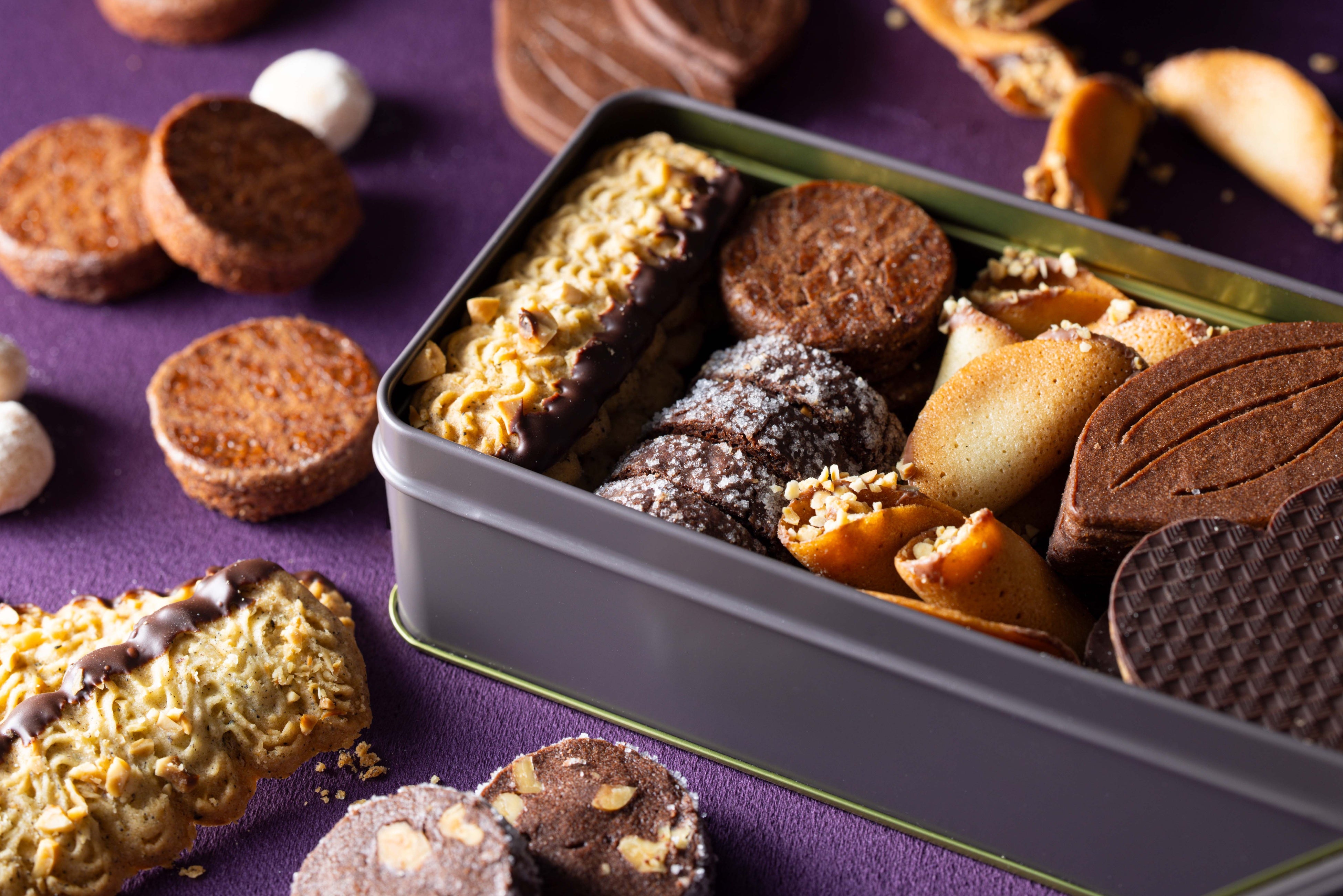 バレンタイン限定のクッキー缶には、選りすぐりのカカオを贅沢に使用し、深い味わいとともに異なる食感を堪能できる7種類のクッキーを詰め合わせました。ナッツが香るジャンドゥーヤを包んだ「ラング ド シャ」や、ほろほろ食感のクッキーに和三盆をまぶした「ブールドネージュ」、アールグレイとヘーゼルナッツ風味の「サブレ ポッシュ」はシェフ渾身の新作。大切な方へのギフトとして、また自分へのご褒美としてもぴったりな、格別な味わいをお届けいたします。