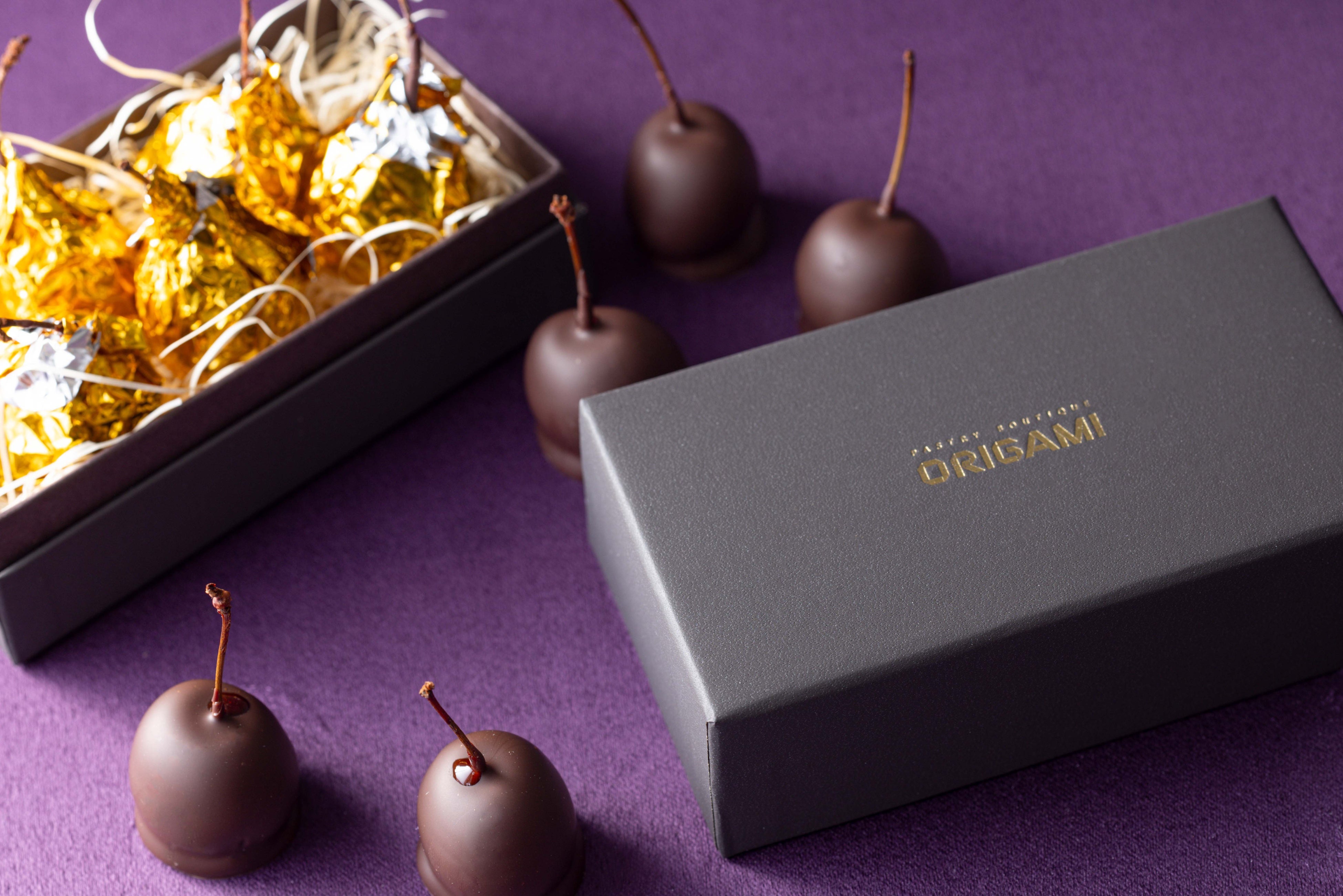 新作の「ボンボンショコラ」の繊細な和柄はシェフパティシエによるオリジナルデザイン。フルーツやスパイスの絶妙なハーモニーをビターチョコレートの中に閉じ込め、目にも美しい和柄に仕上げました。また、2種類の味を楽しめる「マスカットレーズンショコラ&抹茶ミュスカディーヌ」は、シンプルなデザインの中に果実の香りと抹茶の美味しさを詰め込んだチョコレート。「チェリーボンボン」は、ブランデーで漬け込んだ大粒のチェリーと濃厚なビターチョコレートが奏でる、深みのある味わい。時間とともに変化する食感の奥深さが、大人のための特別なひとときを演出します。