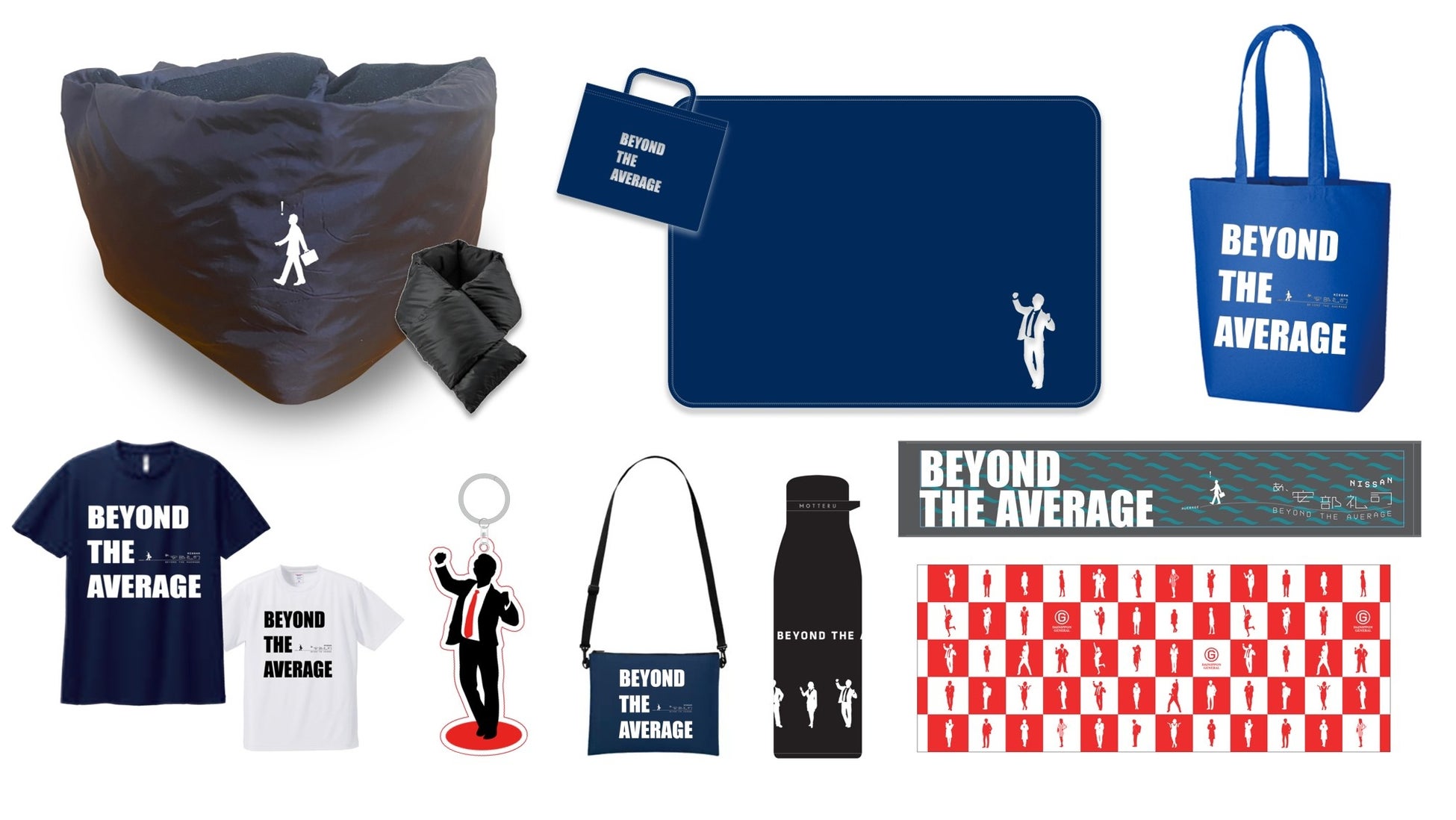 下段:左から Tシャツ、アクリルキーホルダー、サコッシュ、サーモステンレスボトル、タオルマフラー(上)、手ぬぐい(下)