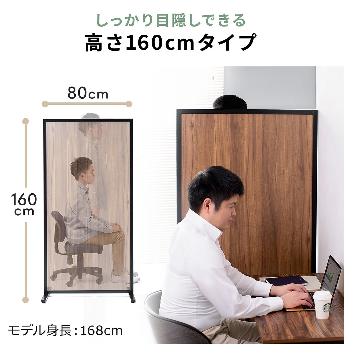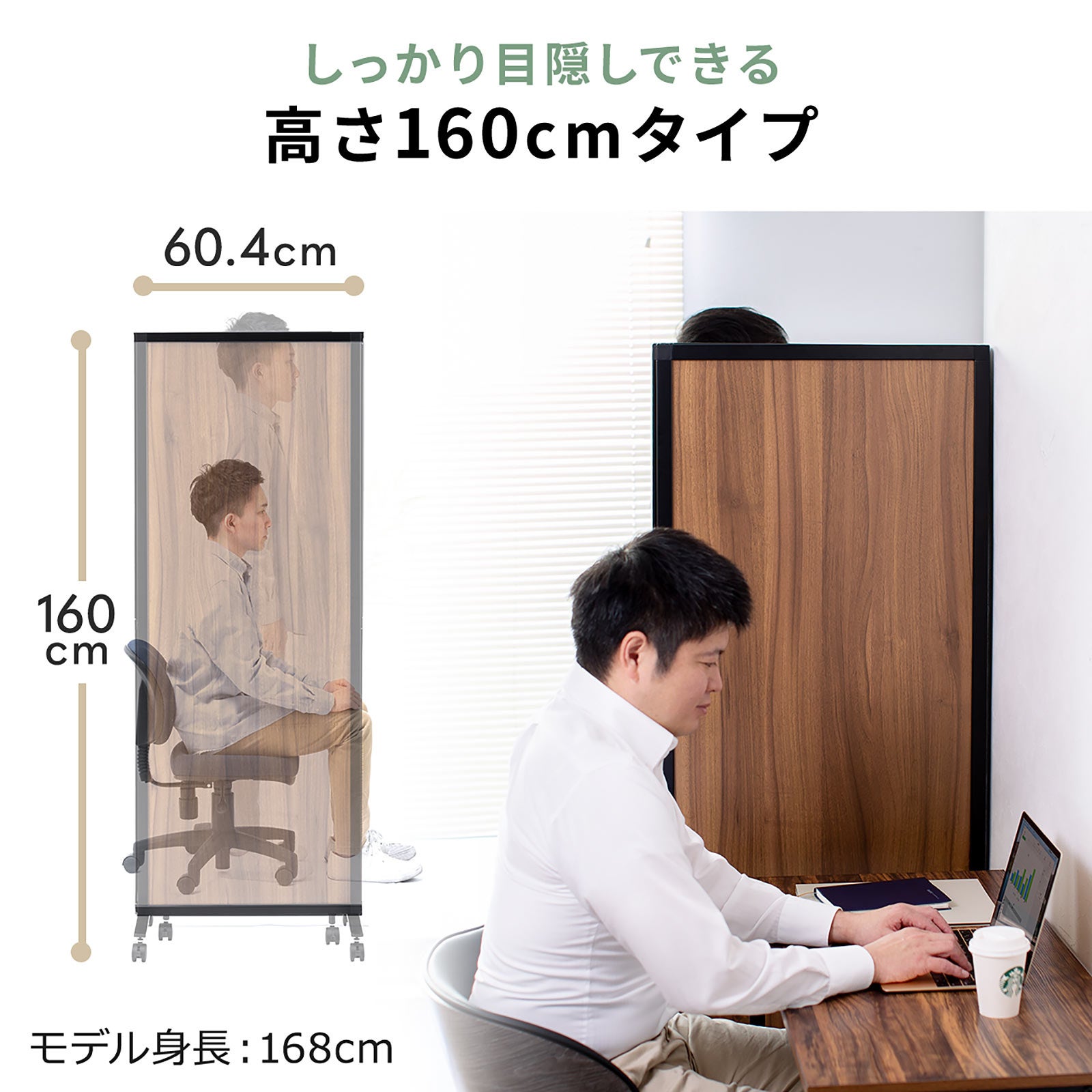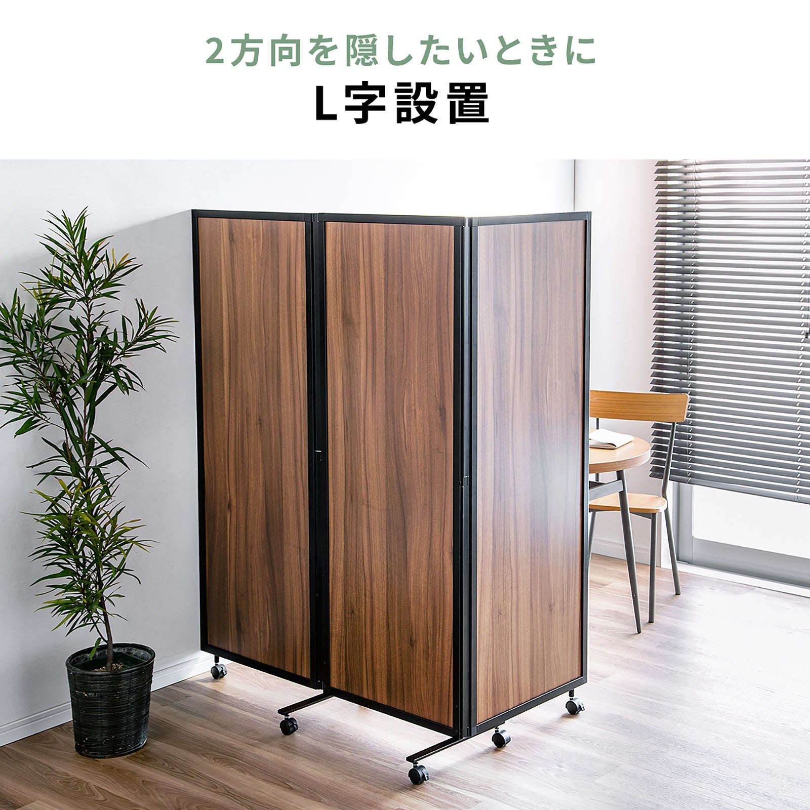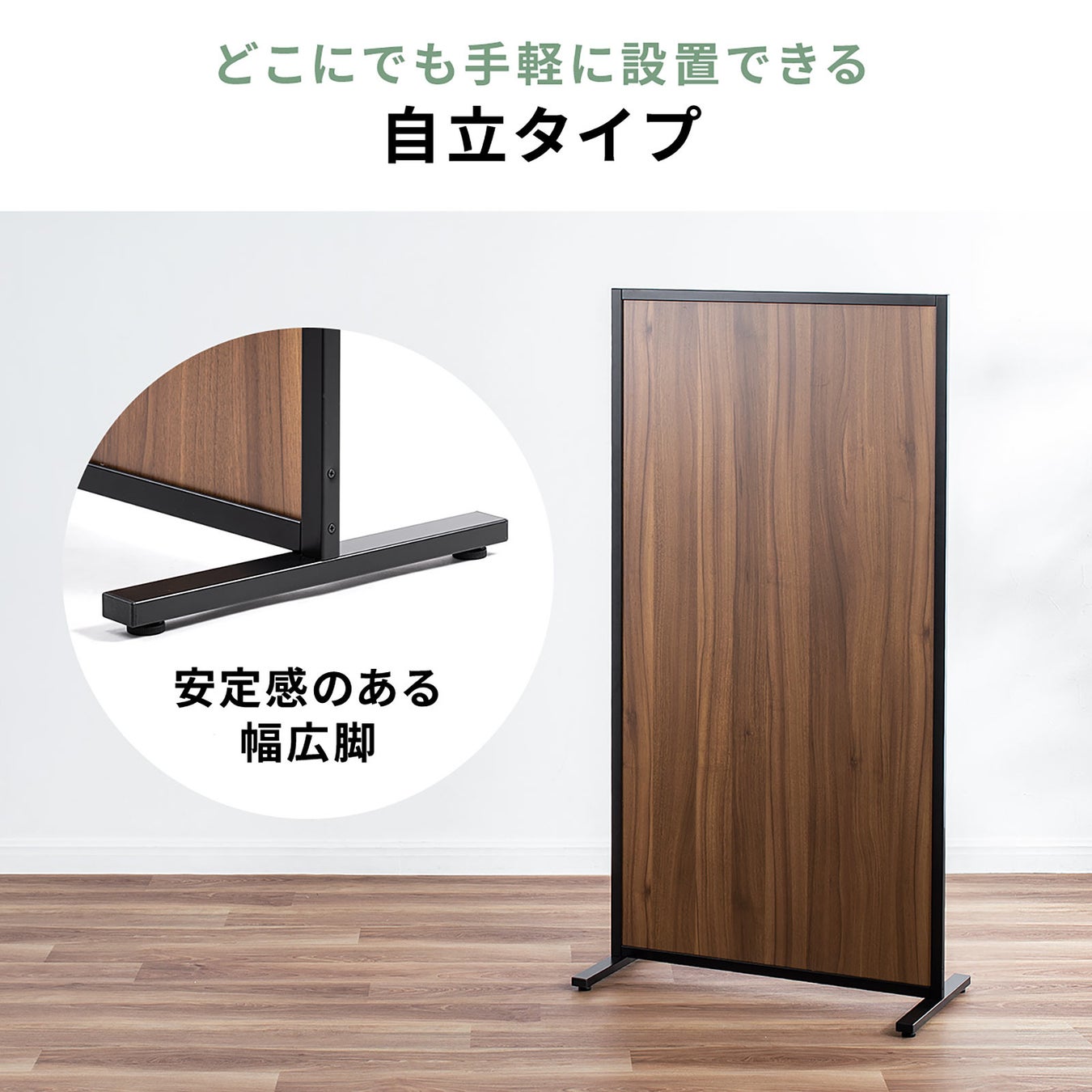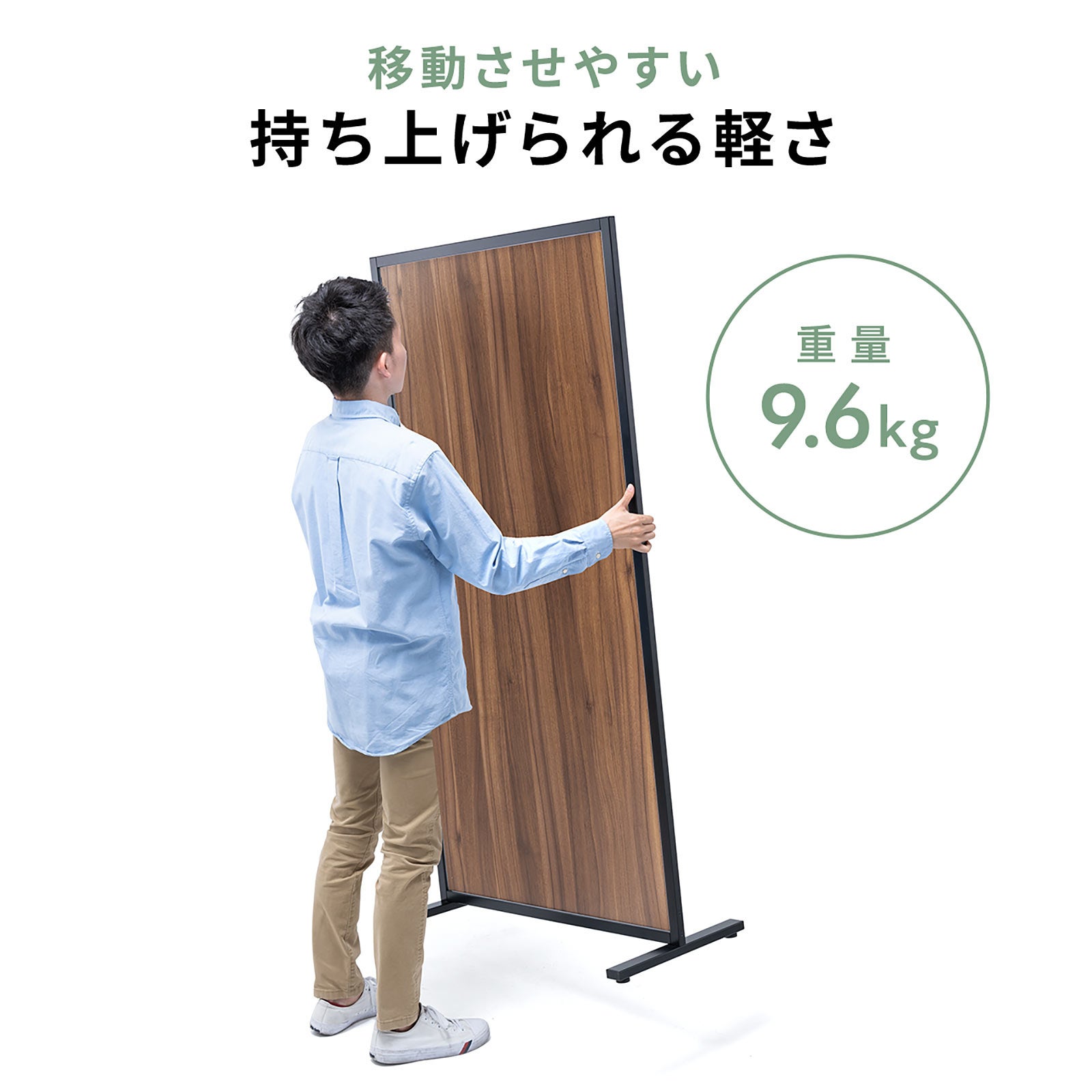 本製品は、木目柄のパネルと黒色のフレームを組み合わせた落ち着いた雰囲気のパーティションです。オフィスや家庭で使用しやすい木目柄を採用しています。