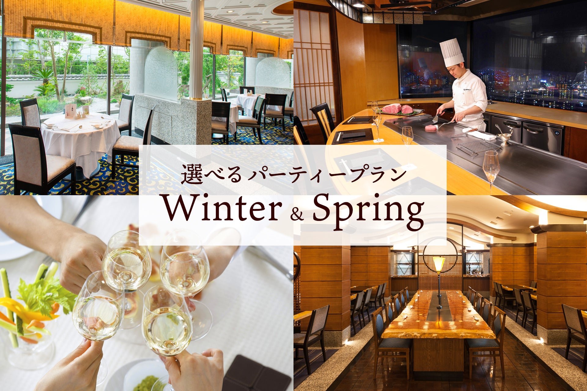 春の訪れとともに迎える歓送迎会シーズン。本プランでは、大切な節目のひとときにふさわしい、和・洋・中の本格料理から、ライブ感あふれる鉄板焼、人気のビュッフェまで、ホテルならではの魅力あふれる5つのレストランが集結いたしました。