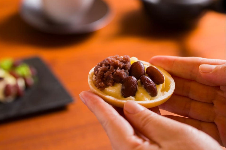 スイーツには、「あんと茶と」を代表する和菓子をメインに、春の訪れを思わせる苺をふんだんに使用した全9品をご用意いたします。「あんと茶と」とのコラボレーションメニューでは、2種の「焼ききんつば」と「豆もなか」をご用意。市場に出回ることの少ない北海道産の白花豆やあずき、紫花豆などの希少地豆にこだわり手焼きして作る看板商品の焼ききんつばと、最中皮の香ばしい香りとサクサクとした食感、そして丁寧に炊き上げた地豆の優しい甘さをご堪能ください。