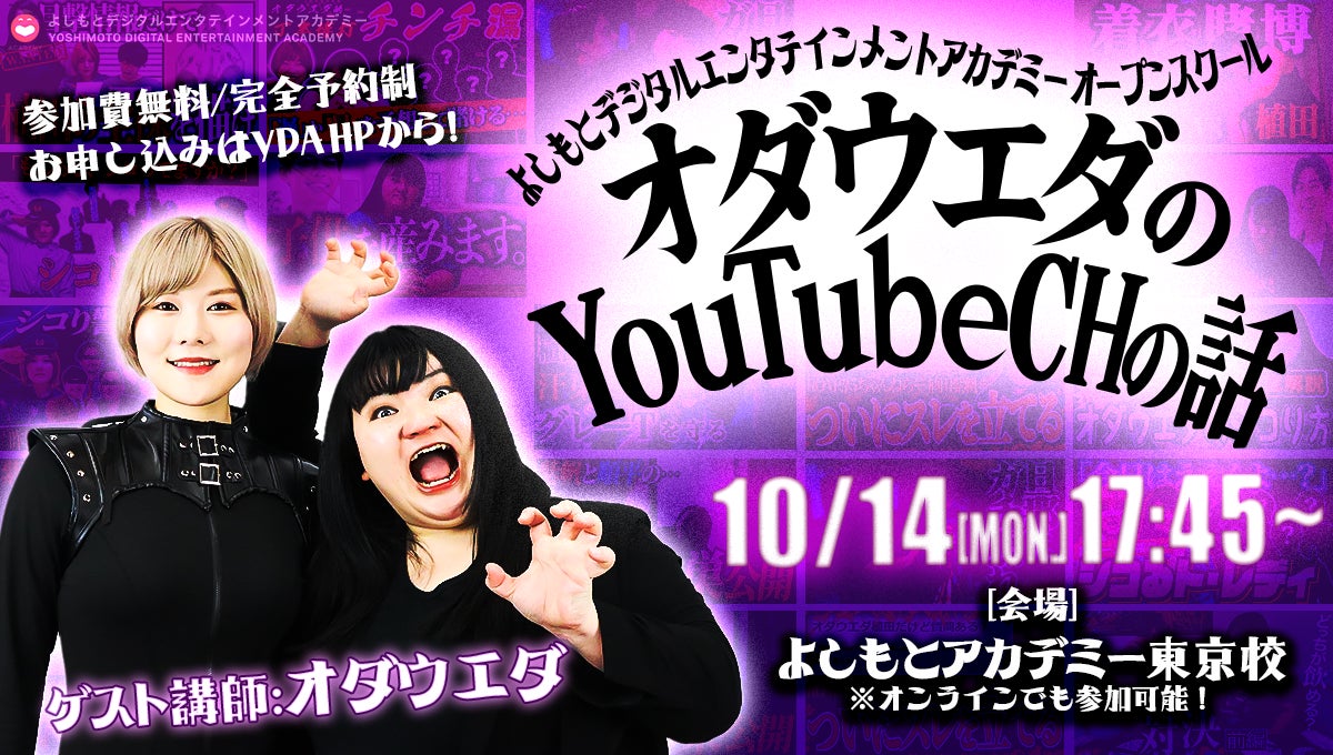 内容:2021年女芸人No.1決定戦THE W 優勝コンビ、オダウエダの話題YouTubeチャンネル「オダウエダ総合案内所」のオープンスクールです。ファンの方はもちろん、芸人さんのYouTube運営などに関わりたい方にも超必見の内容です!