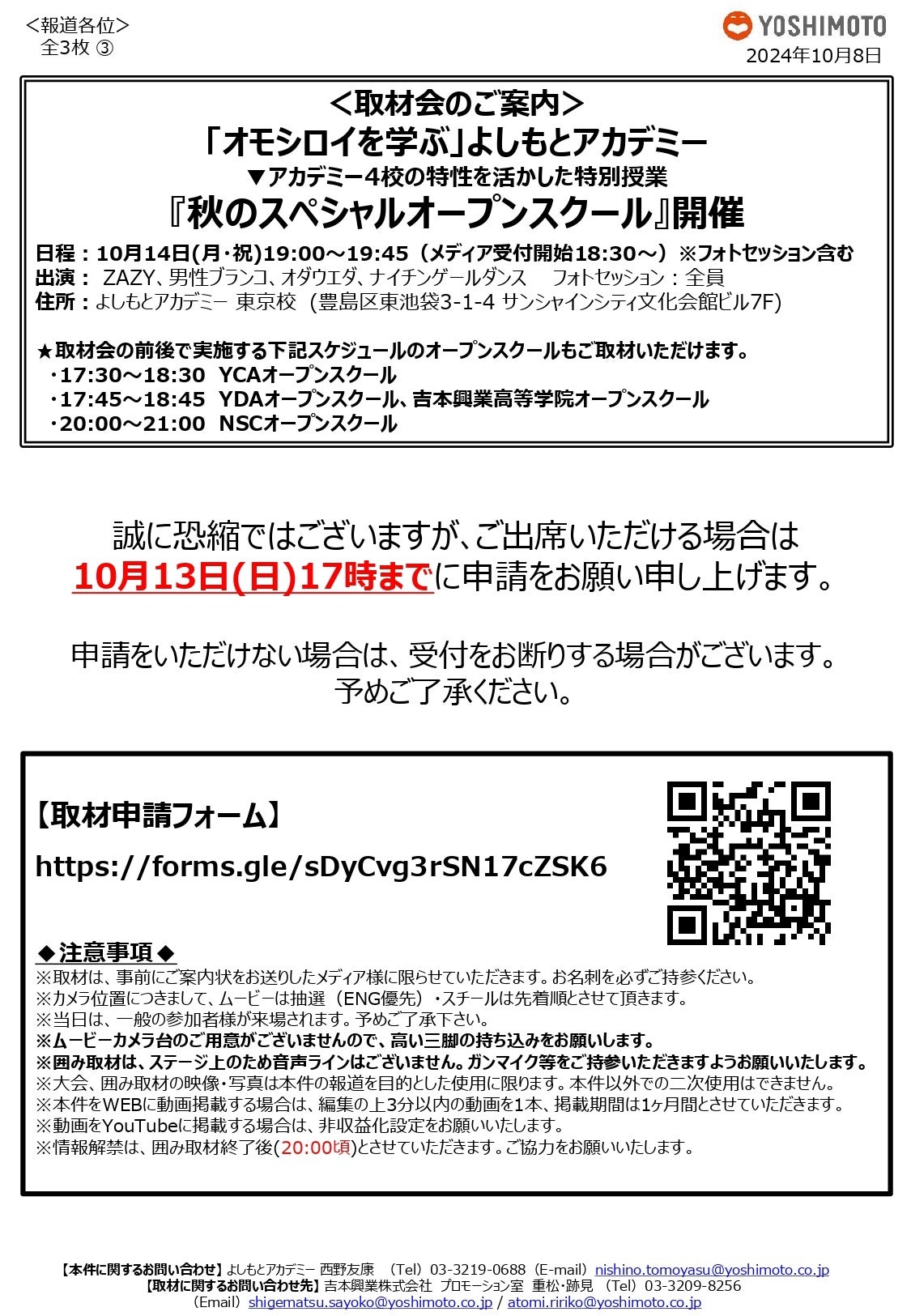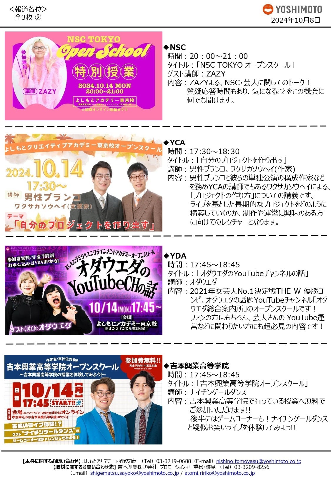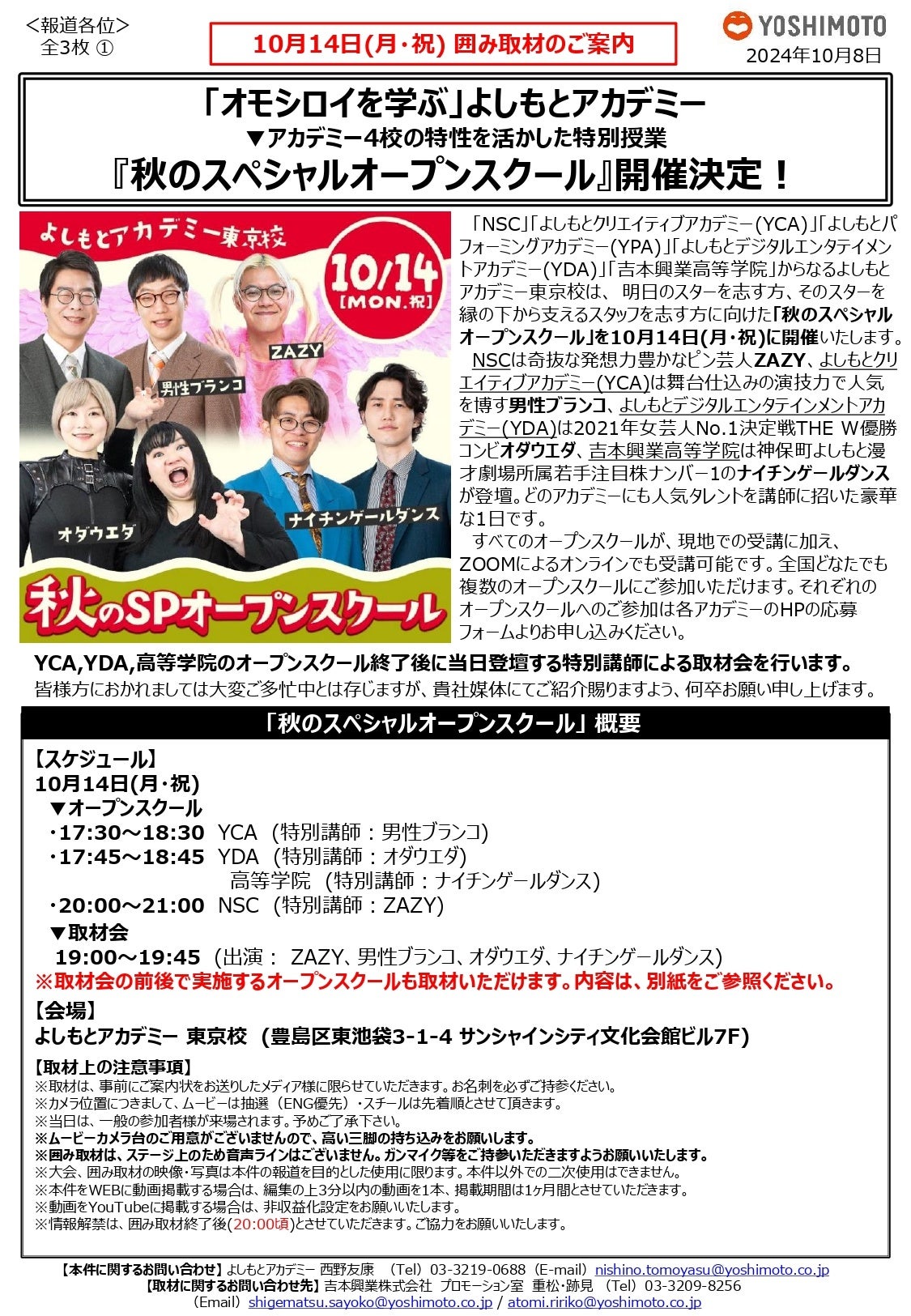 「NSC」「よしもとクリエイティブアカデミー(YCA)」「よしもとパフォーミングアカデミー(YPA)」「よしもとデジタルエンタテイメントアカデミー(YDA)」「吉本興業高等学院」からなるよしもとアカデミー東京校は、 明日のスターを志す方、そのスターを縁の下から支えるスタッフを志す方に向けた「秋のスペシャルオープンスクール」を10月14日(月・祝)に開催いたします。
