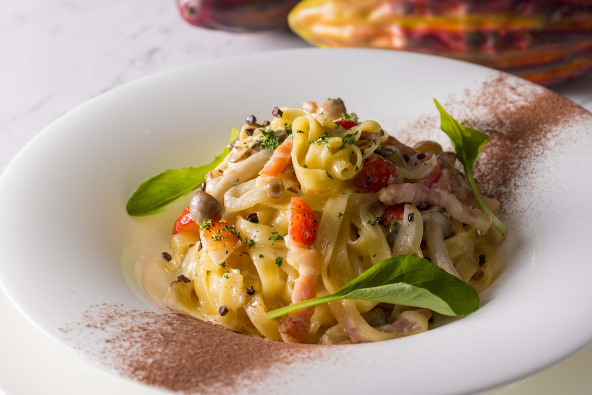 昨年、ご好評をいただいた本フェアが新たなメニューで登場。ココアやチョコレートを使用した3種のメインディッシュ(肉、魚、パスタ)からお好みの一皿をお選びいただけます。肉料理は、ロシアから伝わったといわれるフランス風ハンバーグ“ビトック”をアレンジしてご用意いたします。チョコレートの風味とフランボワーズの酸味を加えた濃厚なデミグラスソースが、ジューシーな肉の旨味を引き立てます。魚料理は、香ばしく焼き上げたアトランティックサーモンに、八丁味噌とチョコレートをバランスよくブレンドしたコク深いまろやかなソースを添え、和洋の絶妙なハーモニーをお楽しみいただける一皿に仕上げました。そして、パスタには、ホワイトチョコレートを用いたほんのり甘いクリームソースをカルボナーラ仕立てにしてご用意。もちもち食感のフィットチーネにソースがよく絡みます。カカオ豆の一部を粒状にしたほろ苦いカカオニブに、甘酸っぱいイチゴがアクセントとして加わり、ベーコンなどの塩味のある食材とも相性抜群です。