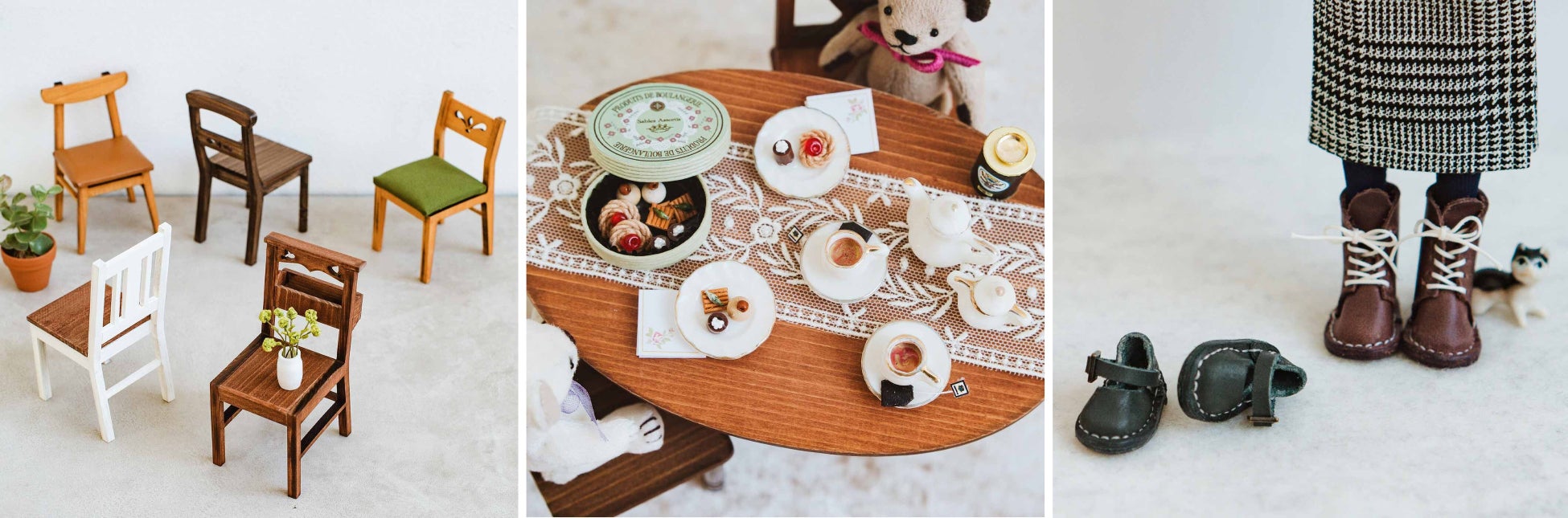 1/6サイズドールのための「アンティーク風ミニチュアチェア」や「ティーセットをはじめとするインテリア小物」、「本革で作る靴」など。どれも本物そっくりなミニチュア手づくりキットが、続々登場しています。