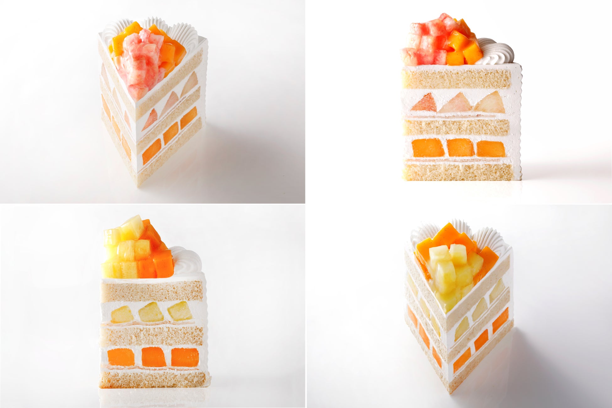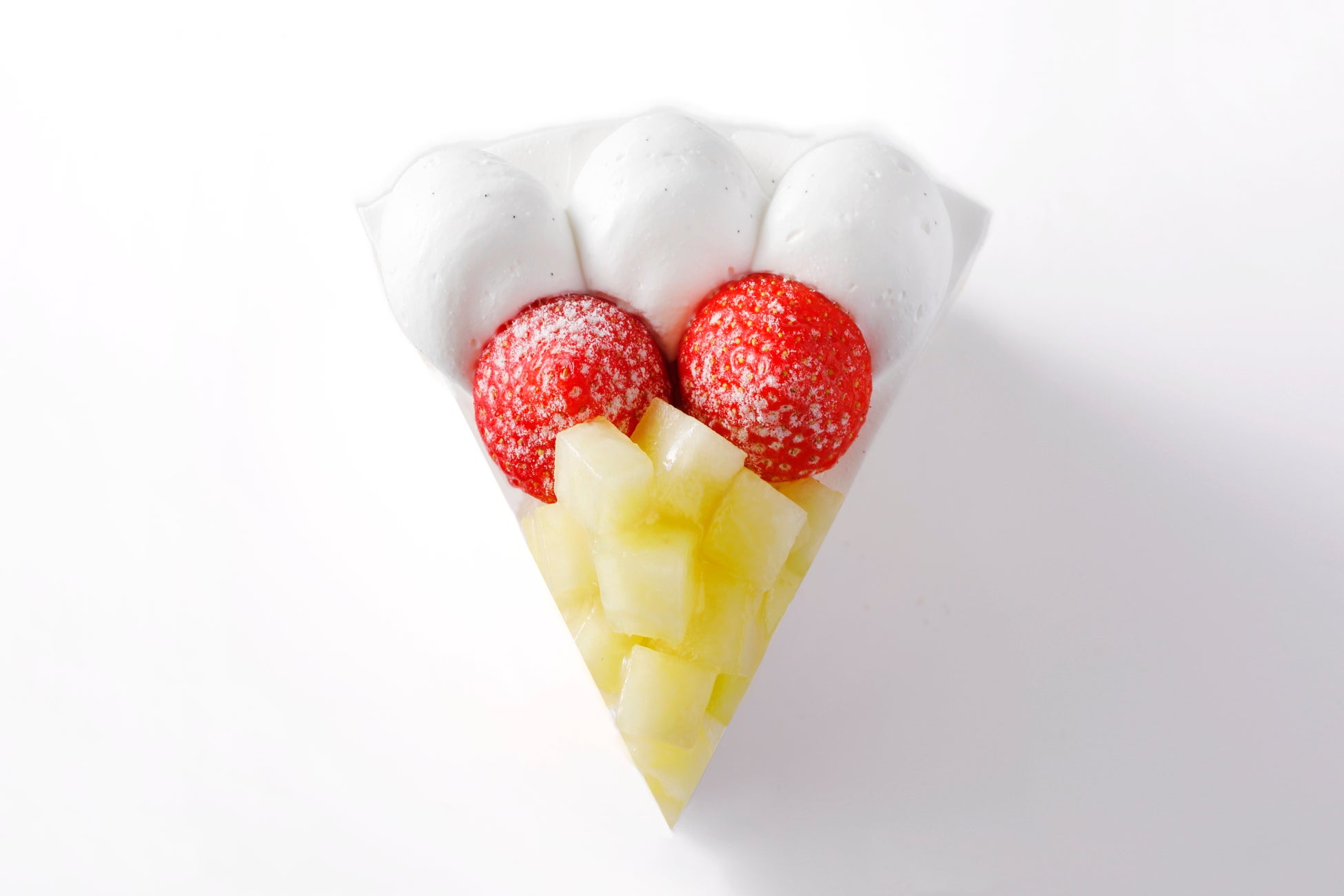 12月から登場した『エクストラスーパーダブルショートケーキ(メロン&あまおう)』。九州大牟田産生クリームに和三盆やバニラビーンズを加え、優しい甘さと軽やかな口当たりに仕上げたクリームに、無農薬の玄米を食べて育った鶏の卵「玄米卵」を使用したふわっと柔らかな食感のスポンジをあわせました。1層目には、甘み・酸味・香りの絶妙なバランスを誇る“いちごの王様”「博多あまおう」を、2層目には糖度14度以上の柔らかな果肉で、濃厚な甘みが広がる静岡県産マスクメロンをぎゅっと詰めました。隠し味として、みずみずしく香り高いライチの層を加えることで、口に入れた瞬間のジューシーさと、後味のすっきりとした爽快感を引き立てています。トップには、2つのフルーツを調和させるために、甘く爽やかな香りの「エルダーフラワー葛」を纏わせた豪華“全部乗せ”でデコレーションを施しました。