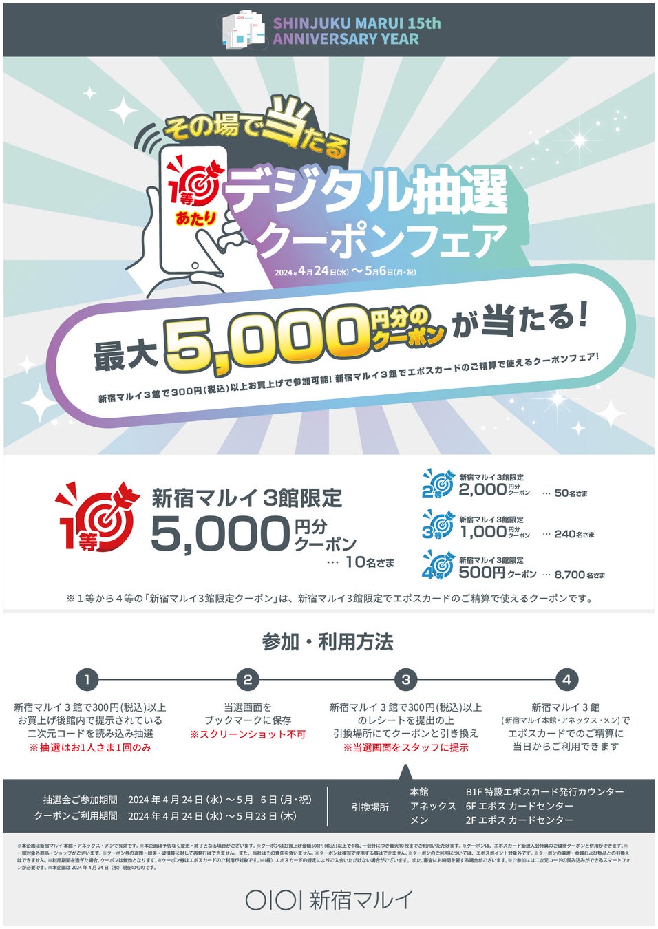 期間中に新宿マルイ3館で300円(税込)以上のお買物いただいたお客さまは、どなたでもデジタル抽選にご参加いただけます。店内に掲示されているフェア告知ポスターより二次元バーコードを読み込むだけで、当選すると新宿マルイ3館で当日からご利用いただけるクーポン券を合計9,000名さまにプレゼント!ぜひこの機会にデジタル抽選クーポンフェアにご参加いただき、お楽しみください。