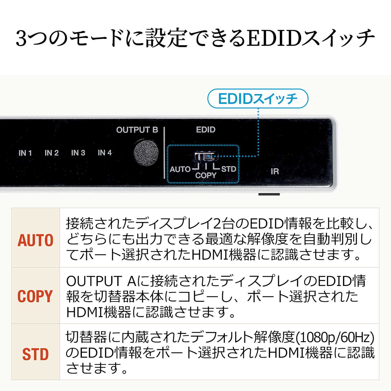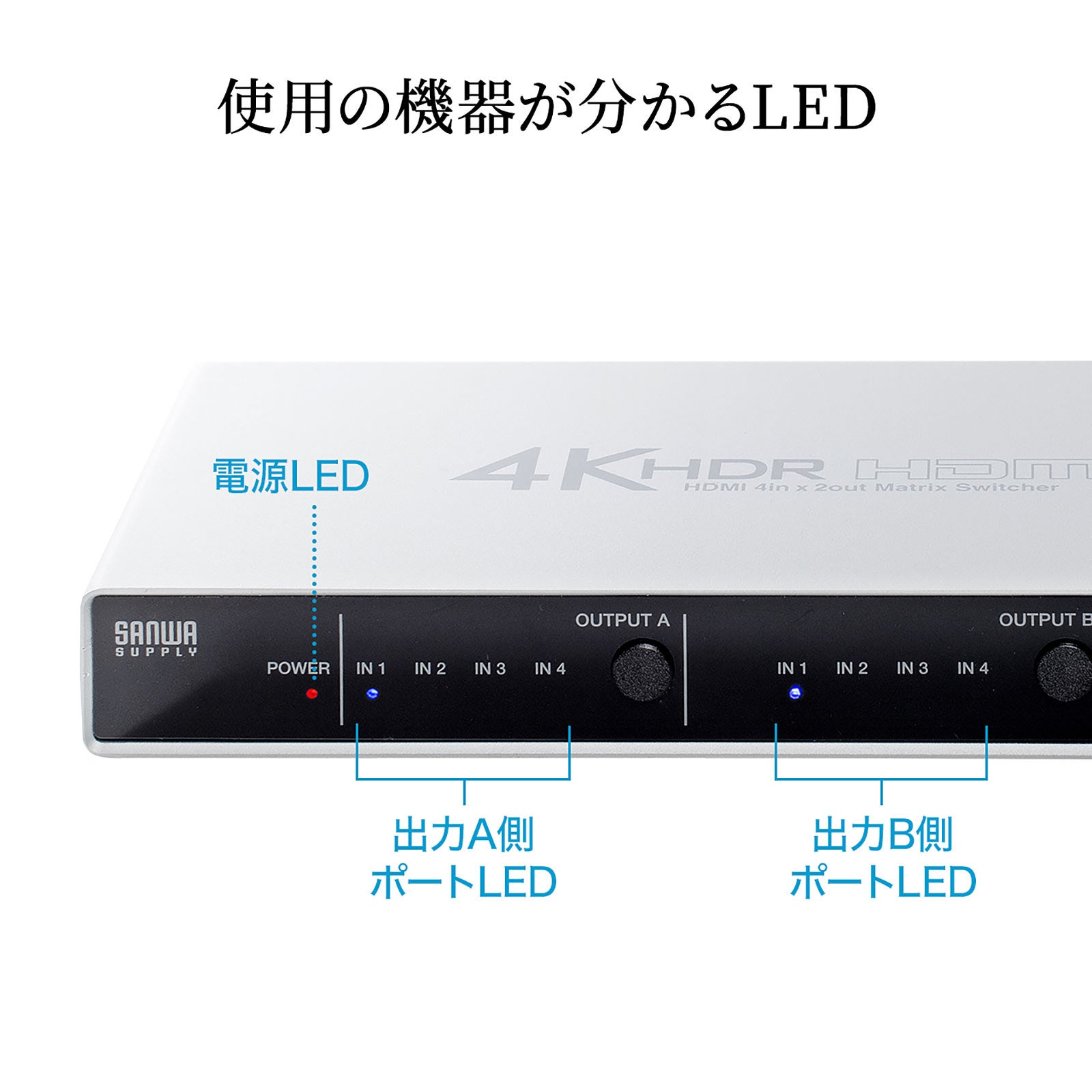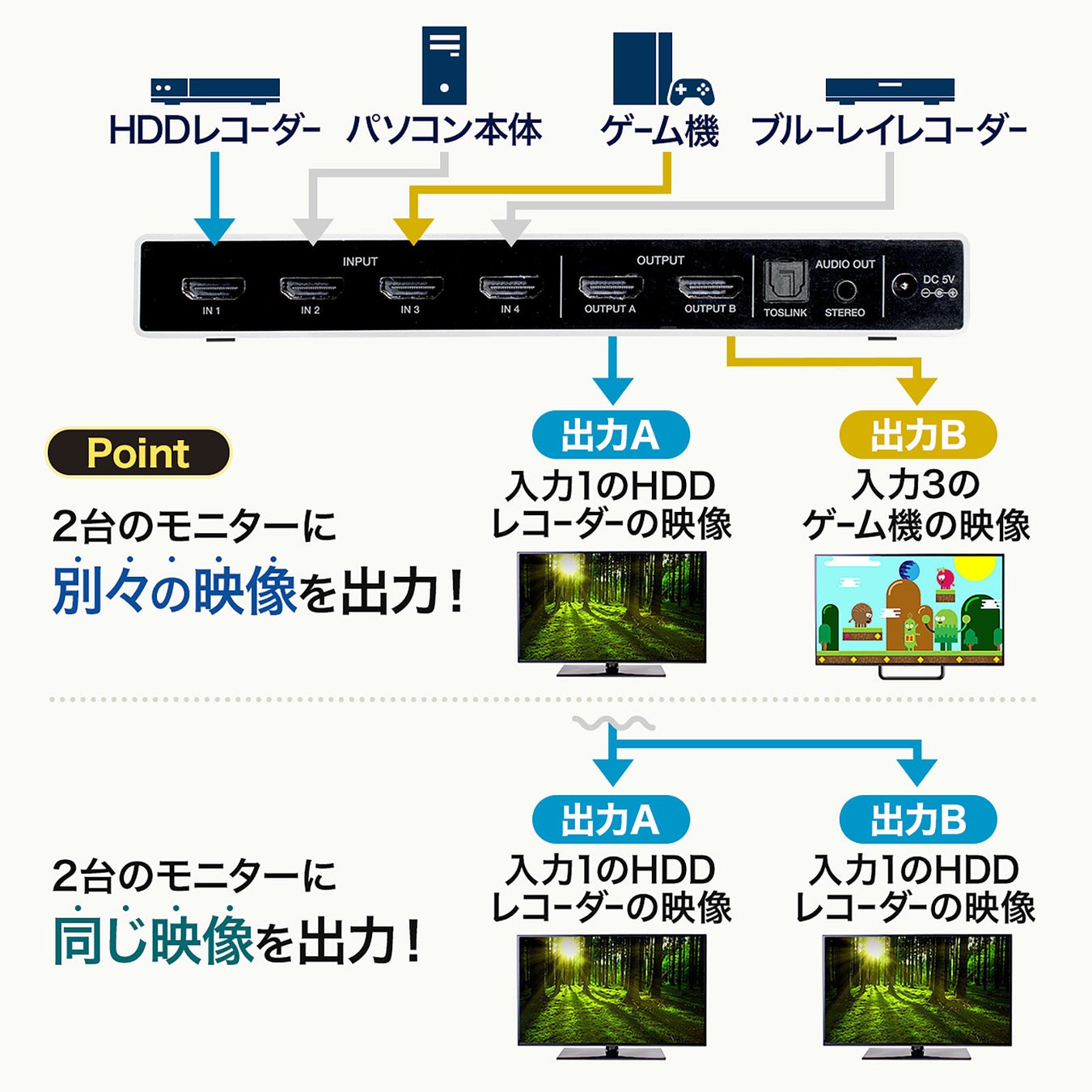HDMIマトリックス切替器 4入力2出力 4K/60Hz HDR対応 光デジタル端子付き