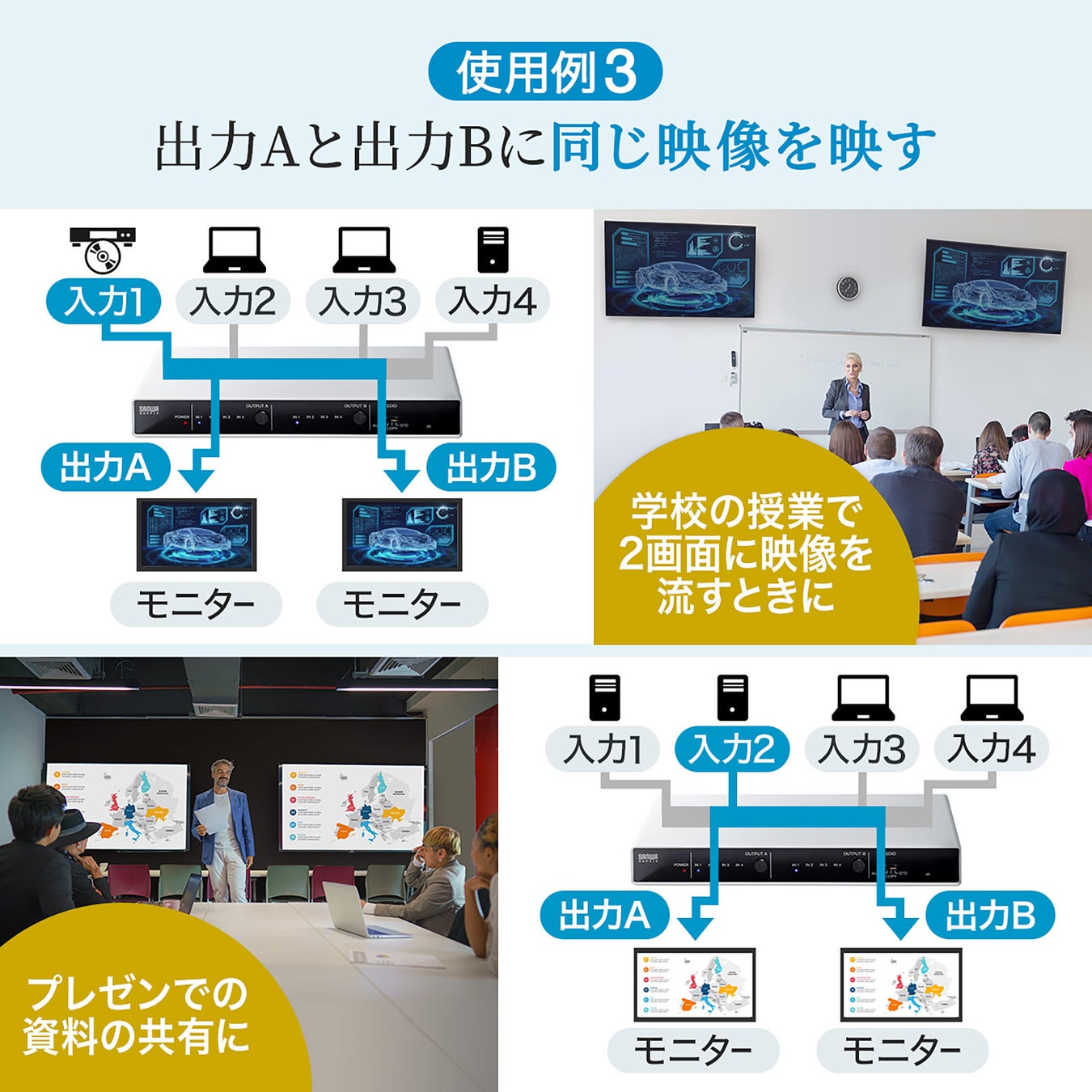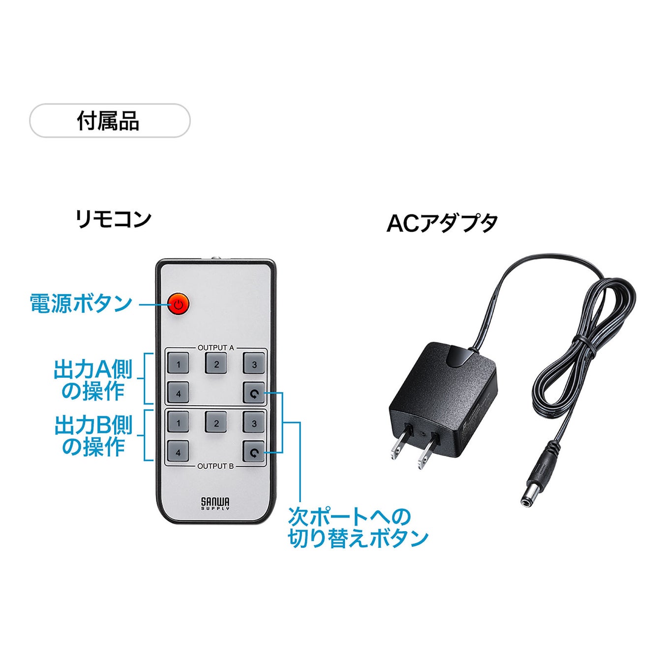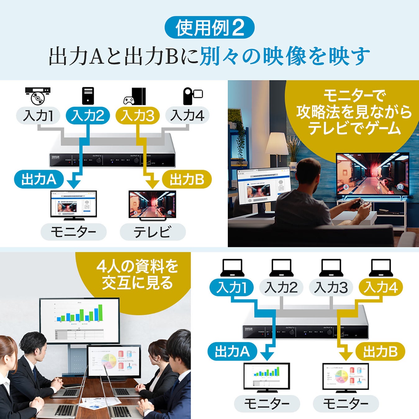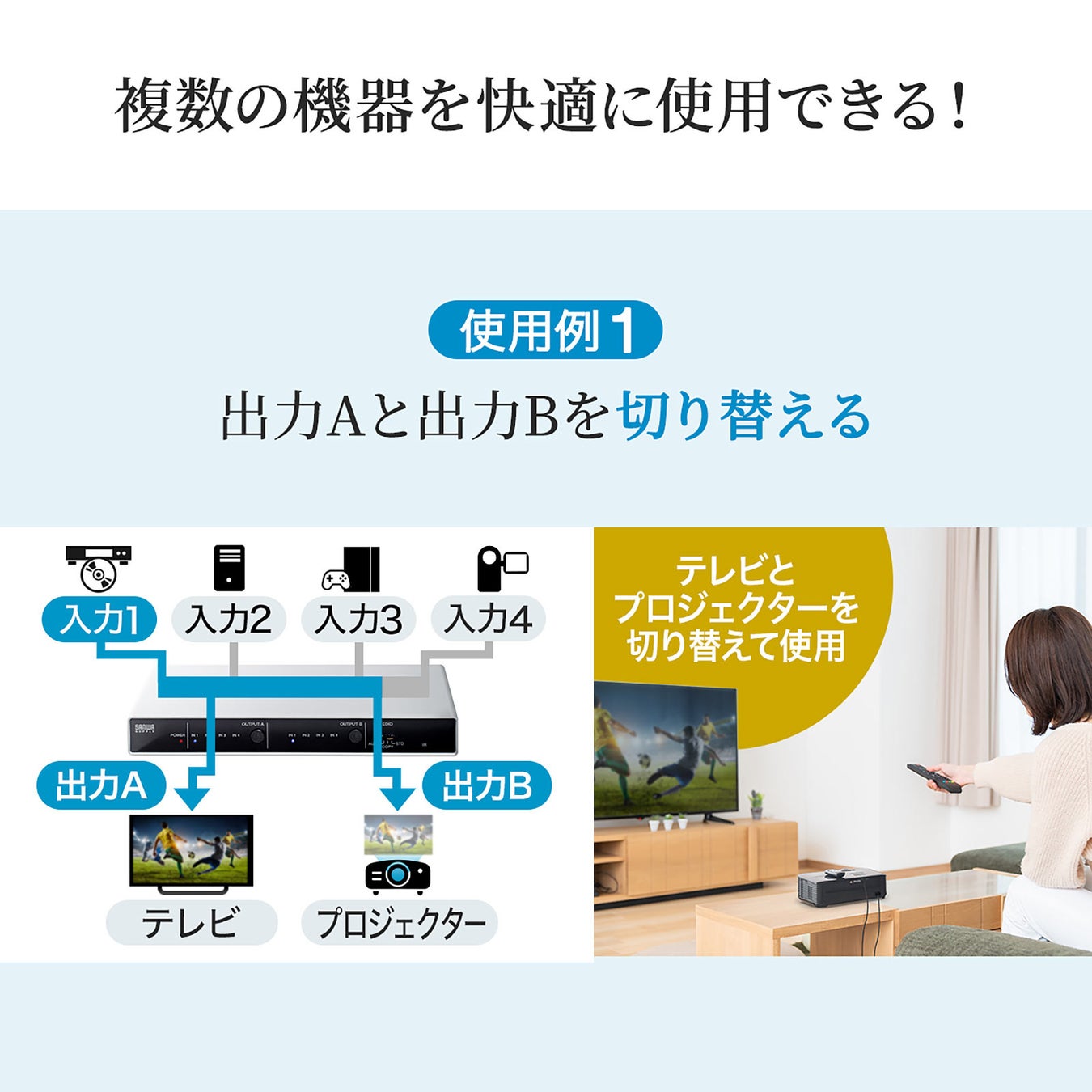 本製品は、パソコンやBDプレーヤーなどHDMI機器4台の映像・音声を、2台のテレビやプロジェクターに切替・分配出力が可能なHDMIマトリックス切替器です。