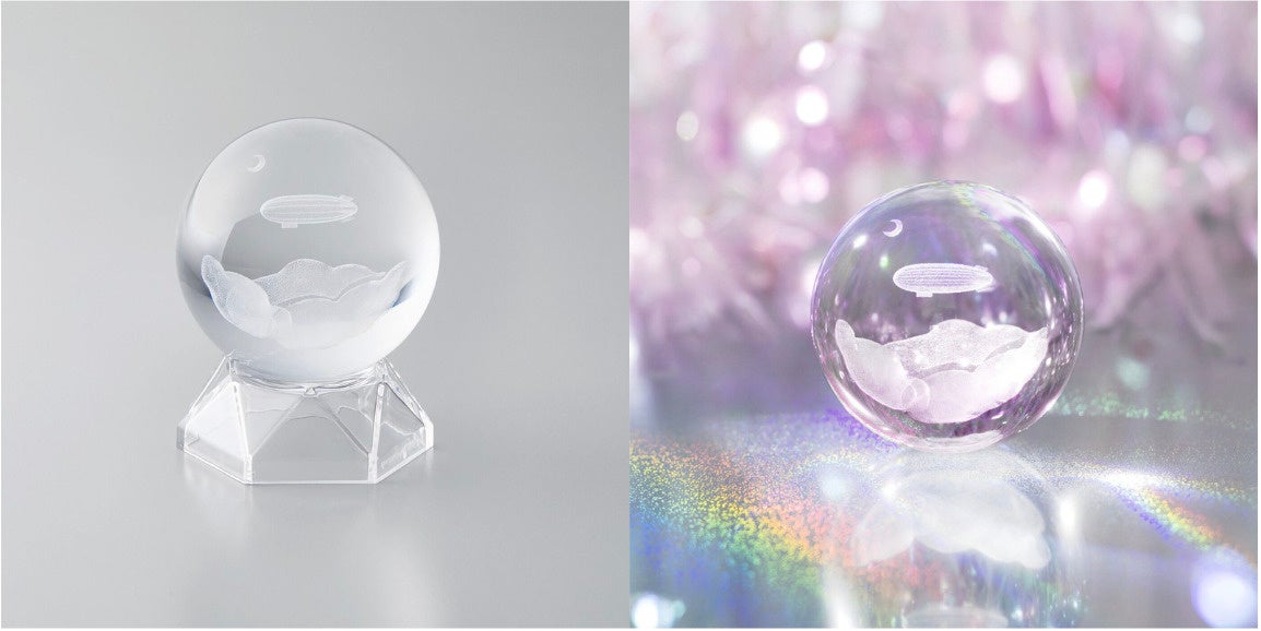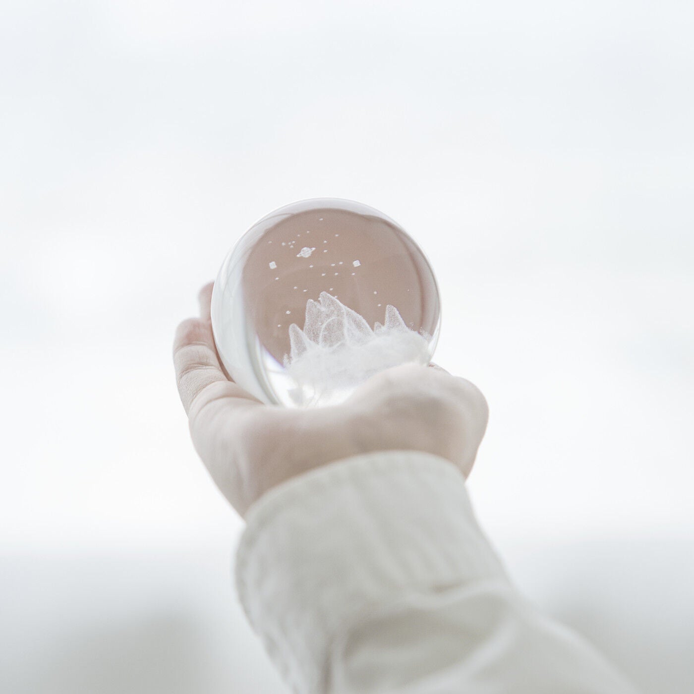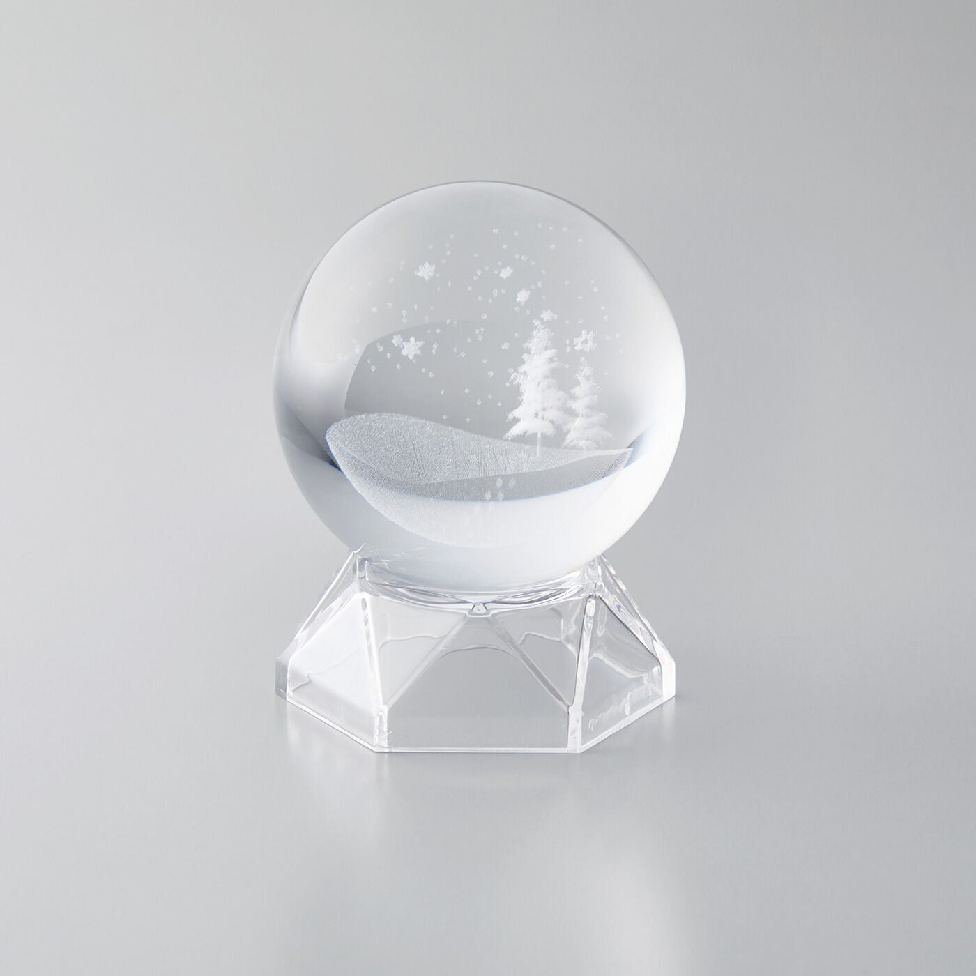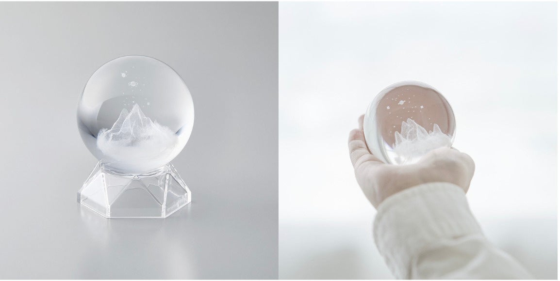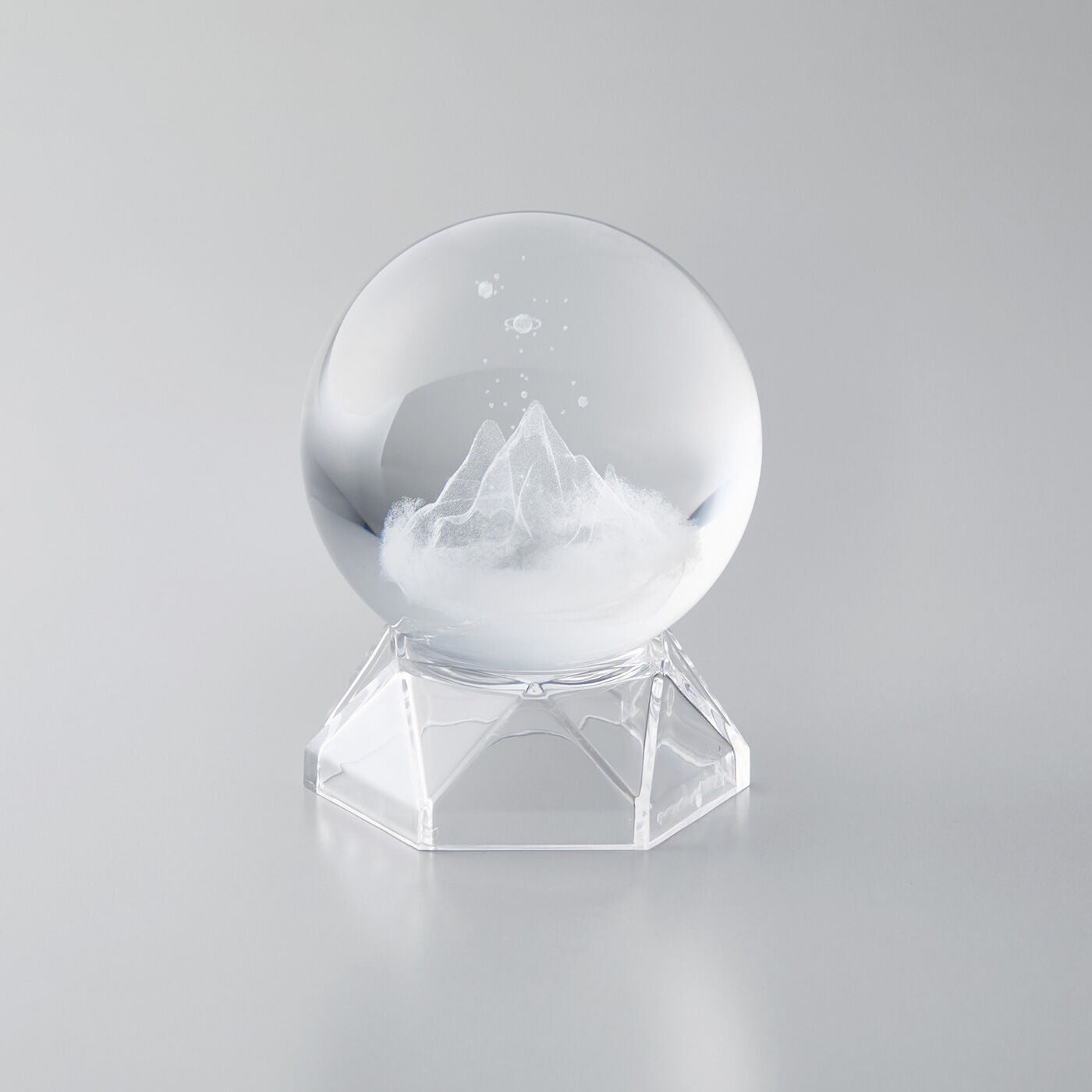ガラス球の中にレーザー彫刻を施した不思議なインテリアオブジェです。夢に現れると吉兆とされる「雪」「山と星」「飛行船」の3つのモチーフを閉じ込めています。付属の透明のスタンドに設置して飾るほか、別売りの木製LEDライト付きスタンドにのせて点灯すると、さらにくっきりモチーフが浮かび上がって幻想的なルームライトとして楽しむことができます。