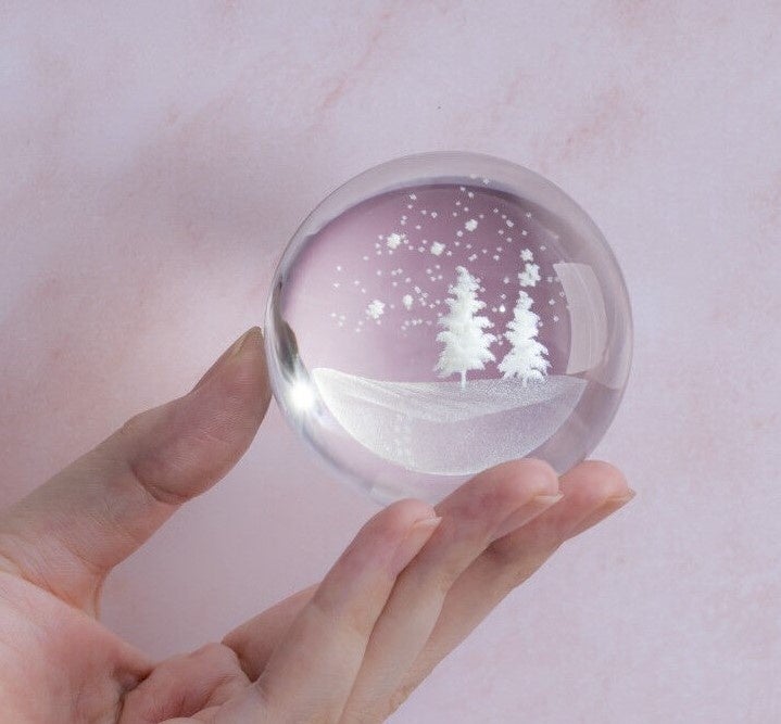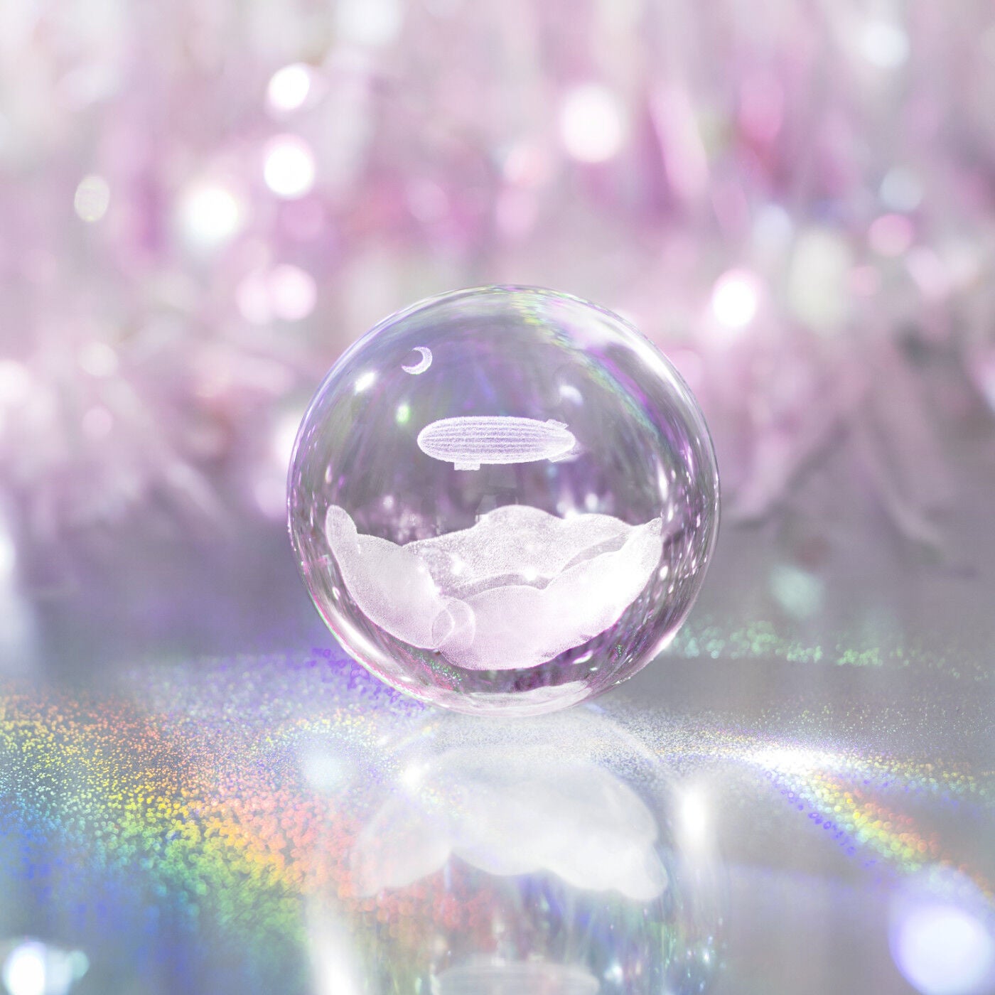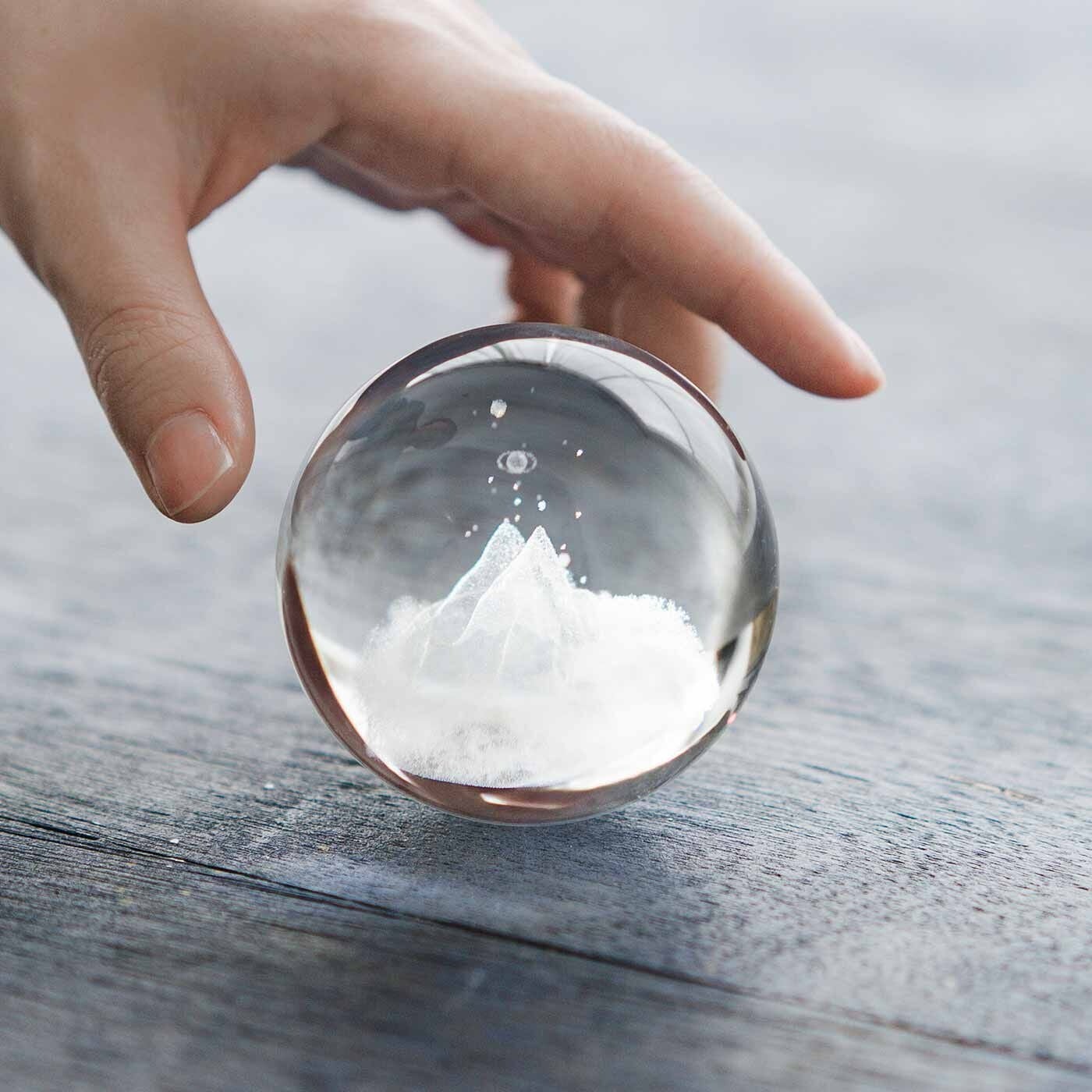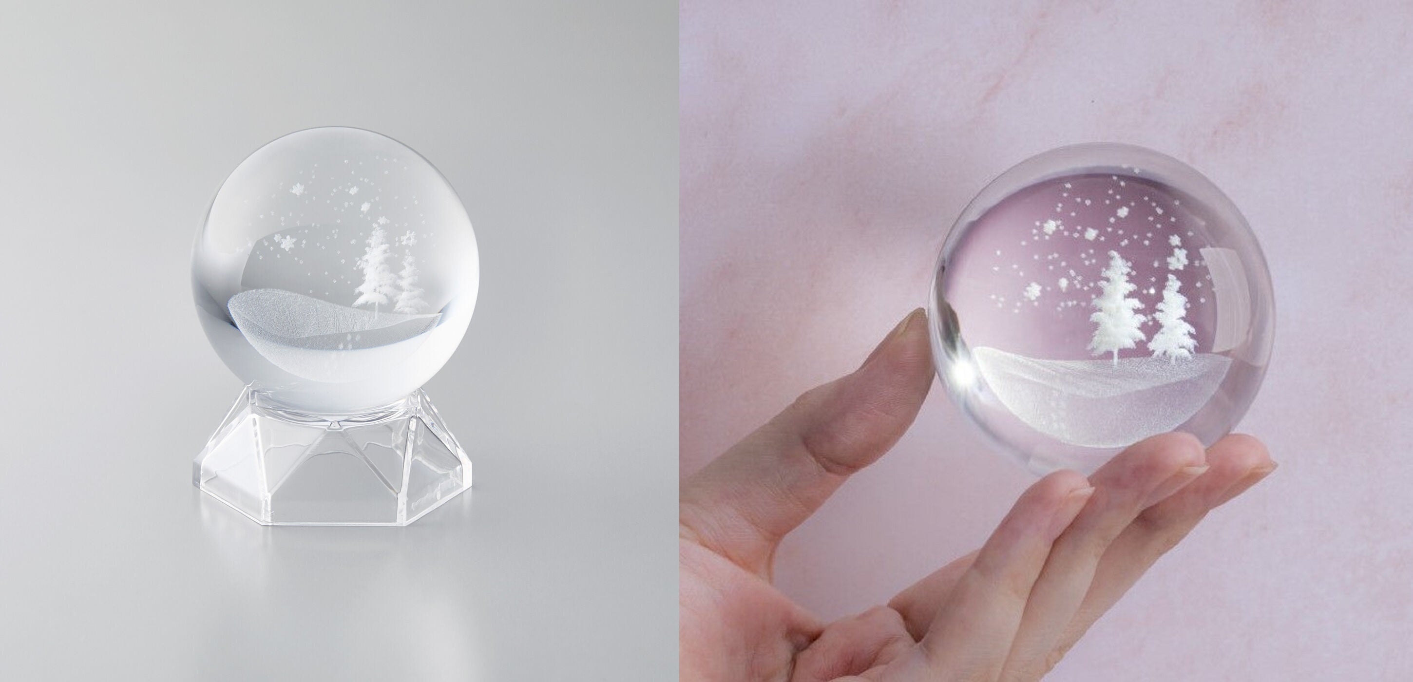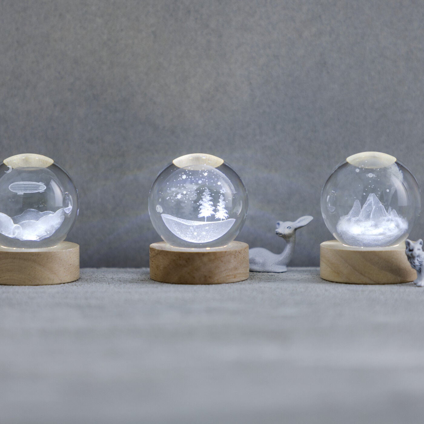 ガラス球の中にレーザー彫刻を施した不思議なインテリアオブジェです。夢に現れると吉兆とされる「雪」「山と星」「飛行船」の3つのモチーフを閉じ込めています。付属の透明のスタンドに設置して飾るほか、別売りの木製LEDライト付きスタンドにのせて点灯すると、さらにくっきりモチーフが浮かび上がって幻想的なルームライトとして楽しむことができます。