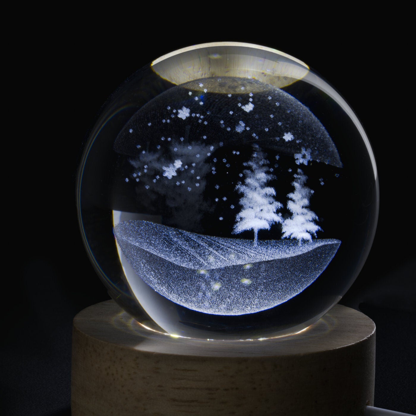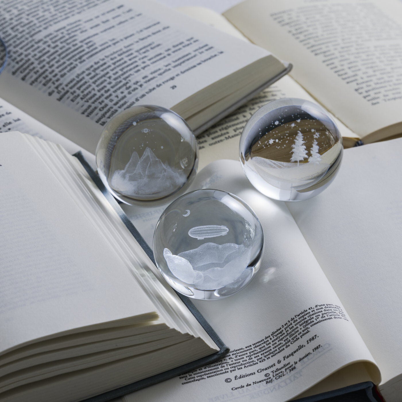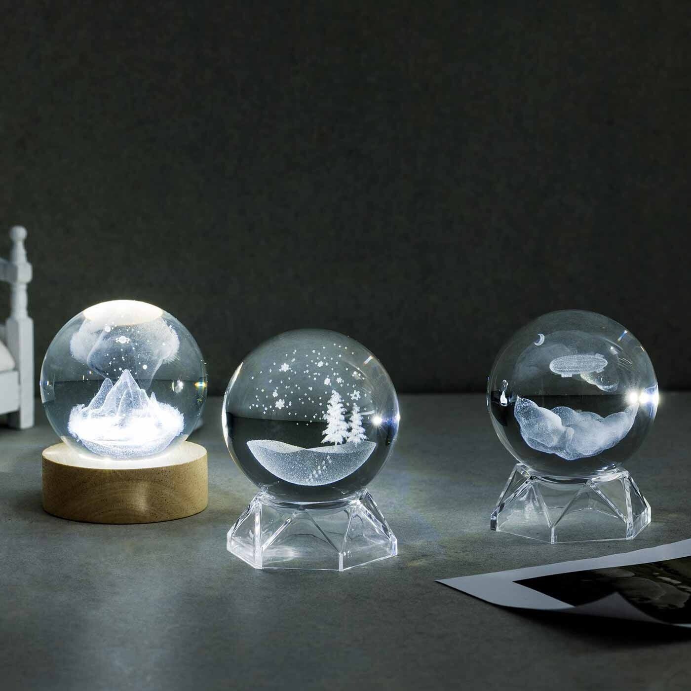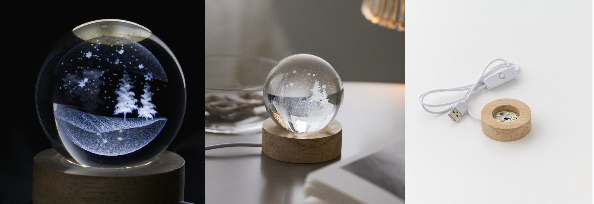 ガラス球の中にレーザー彫刻を施した不思議なインテリアオブジェです。夢に現れると吉兆とされる「雪」「山と星」「飛行船」の3つのモチーフを閉じ込めています。付属の透明のスタンドに設置して飾るほか、別売りの木製LEDライト付きスタンドにのせて点灯すると、さらにくっきりモチーフが浮かび上がって幻想的なルームライトとして楽しむことができます。