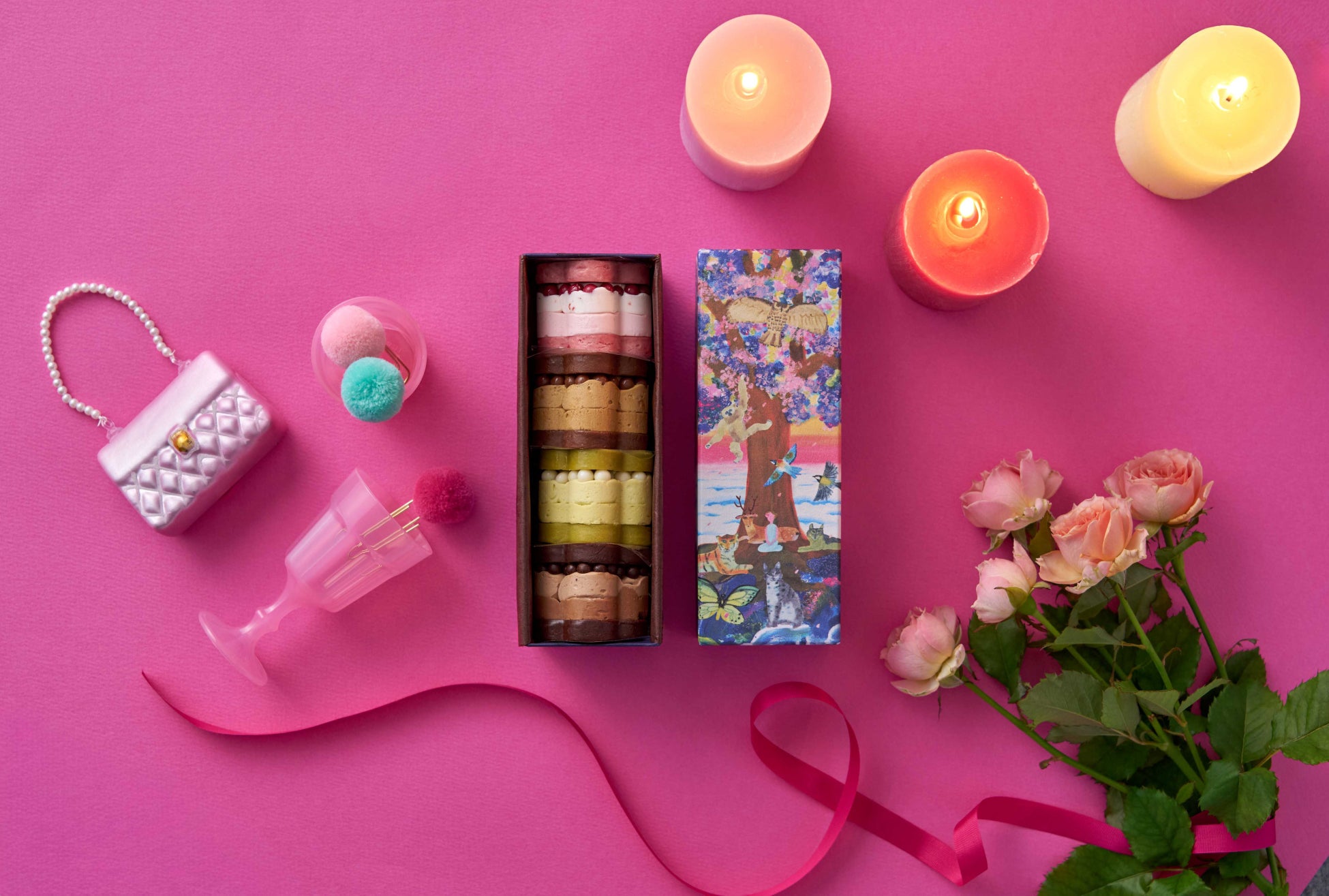 彩った丸缶に、5種のケーキを模したミニチュアチョコを詰め合わせて。