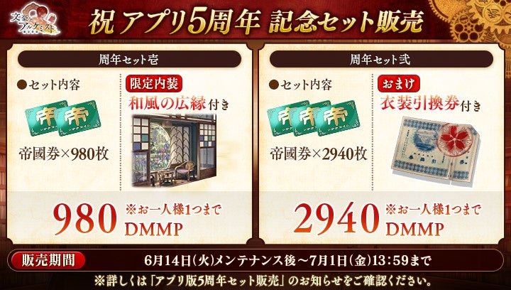 記念内装「和風の広縁」と帝國券が含まれている「周年セット壱」と、衣装引換券と帝國券が含まれている「周年セット弐」がそれぞれ登場いたします。