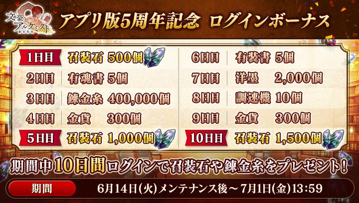 アプリ版5周年を記念して、期間中ログインすると最大で召装石3000個(召装10回分)や錬金糸など豪華アイテムをプレゼント!