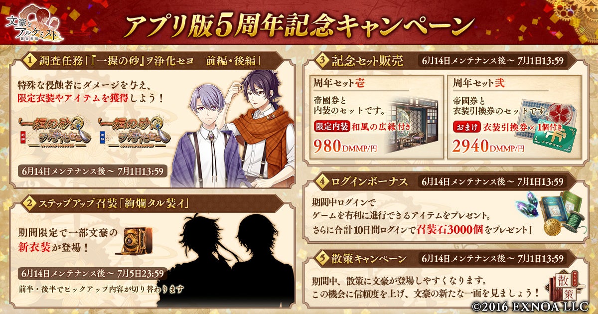 合同会社EXNOA(本社:東京都港区、CEO:村中 悠介、URL:https://games.dmm.com/)が運営するDMM GAMESは、6月14日(火)より、女性向け文豪転生シミュレーションゲーム「文豪とアルケミスト」において、アプリ版5周年を記念した各種キャンペーンを開始いたしました。