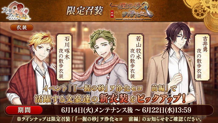 文豪の「衣装」や、会派に装備する事で能力を強化できる「装像」などが入手できるコンテンツ「召装」に、限定召装『「一握の砂」ヲ浄化セヨ 前編』が期間限定で登場します。この召装では、イベント『調査任務「『一握の砂』ヲ浄化セヨ 前編」』で活躍する「石川啄木」「若山牧水」「吉井勇」の新衣装を一定の確率で入手できます。