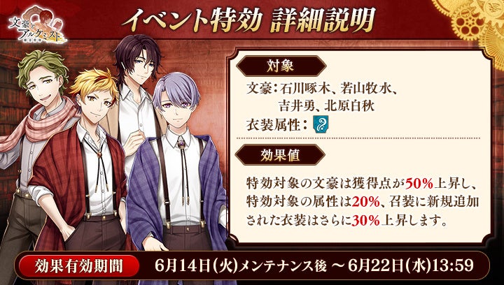 期間中「石川啄木」「若山牧水」「吉井勇」「北原白秋」の衣装を編成して潜書すると、得点の獲得数がそれぞれ50%上昇します。また、「水」属性の衣装を編成して潜書すると、得点の獲得数がそれぞれ20%上昇します。