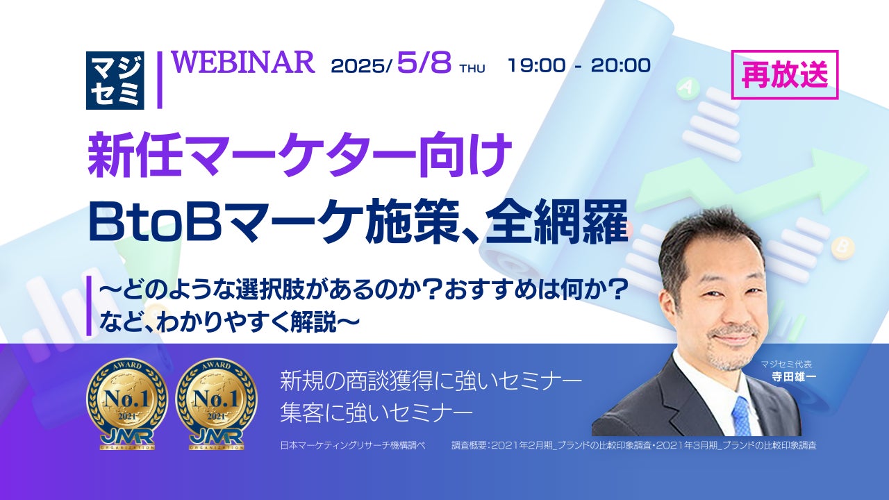マジセミ株式会社は、大変好評をいただいた「(再放送)【新任マーケター向け】BtoBマーケ施策、全網羅」というテーマのウェビナーを再放送します。
