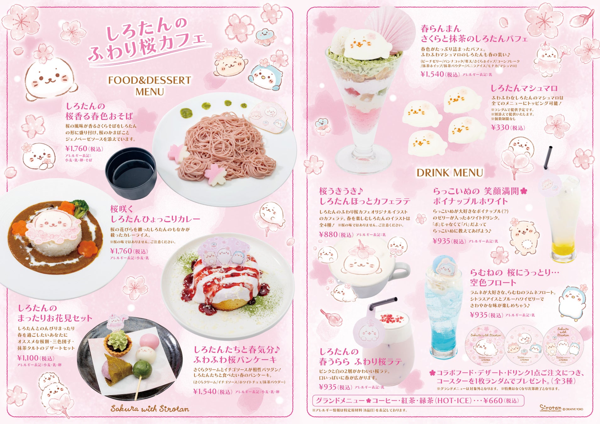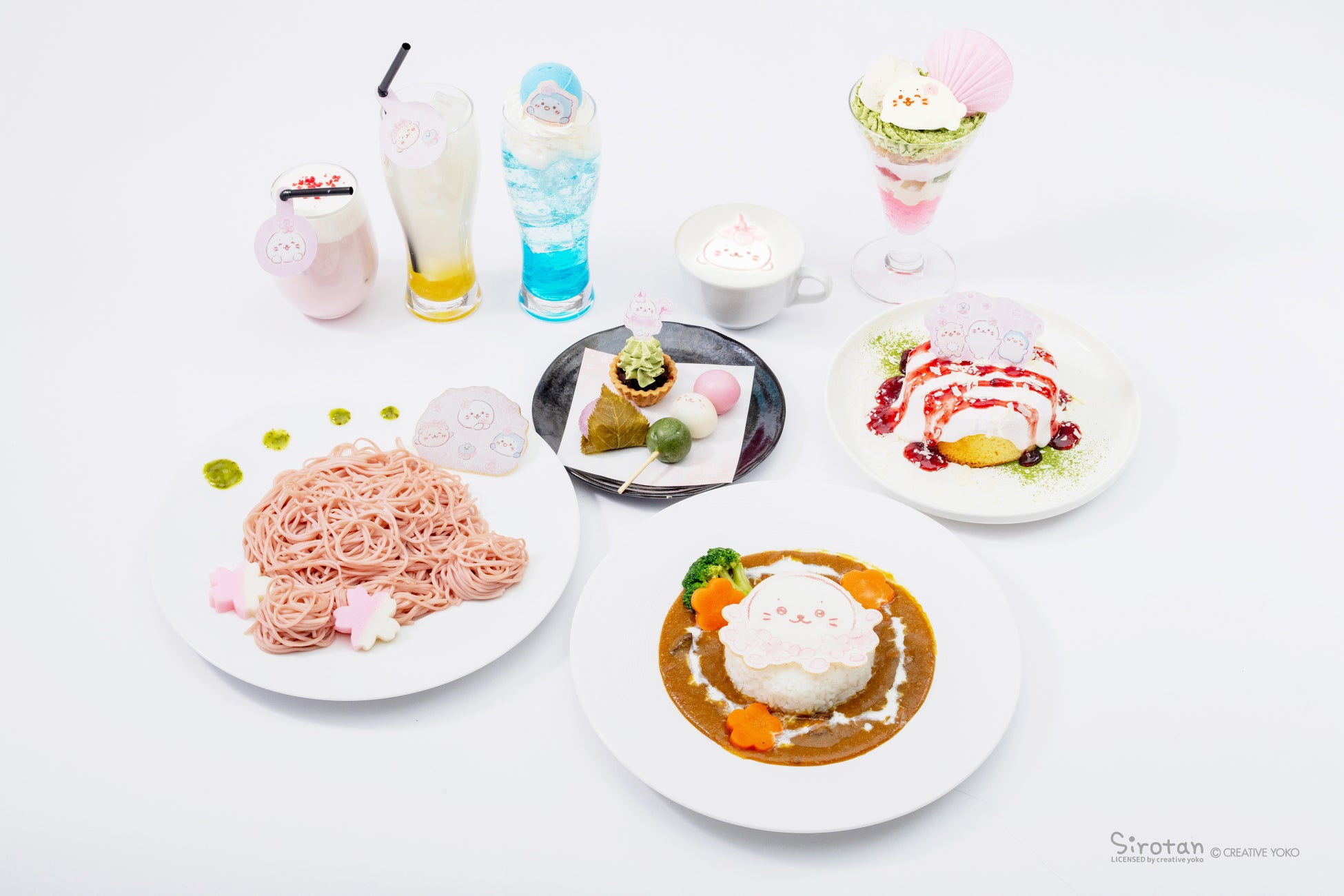 春らしさ満開のさくら風味のメニューや、しろたんのお友達のらっこいぬやらむねをイメージしたメニューをご用意しています。また、当コラボカフェ限定で、桜の飾りを付けたしろたんマシュマロが「春らんまん さくらと抹茶のしろたんパフェ」にのって登場!
