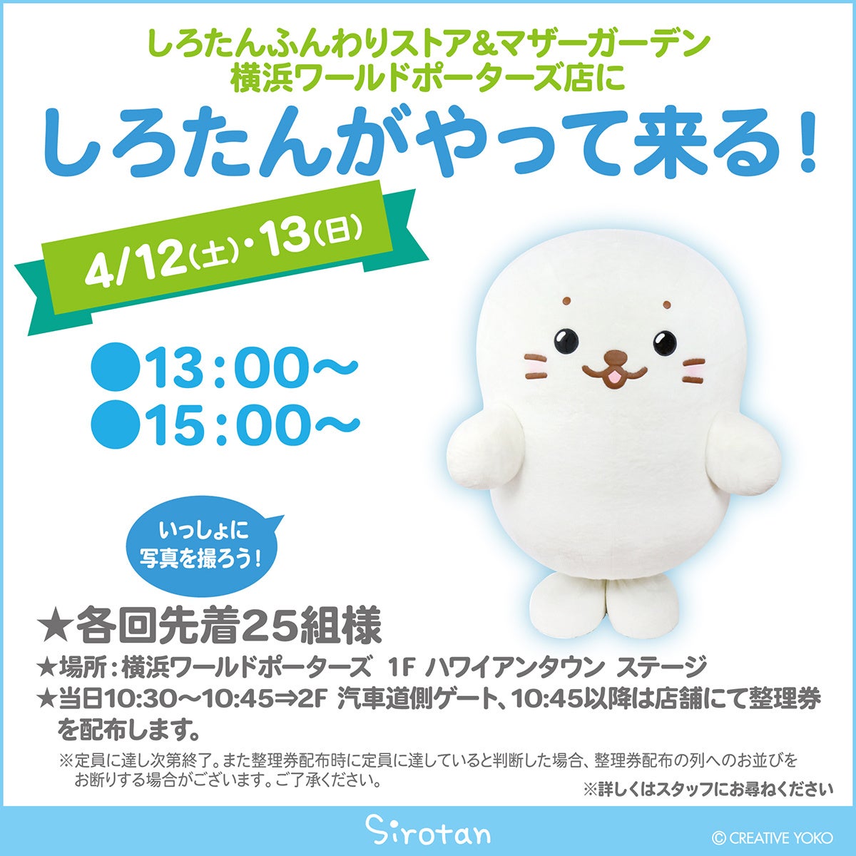 4月12日(土)、13(日)の2日間、横浜ワールドポーターズでしろたんとお写真が撮れるグリーティングが開催されます!
