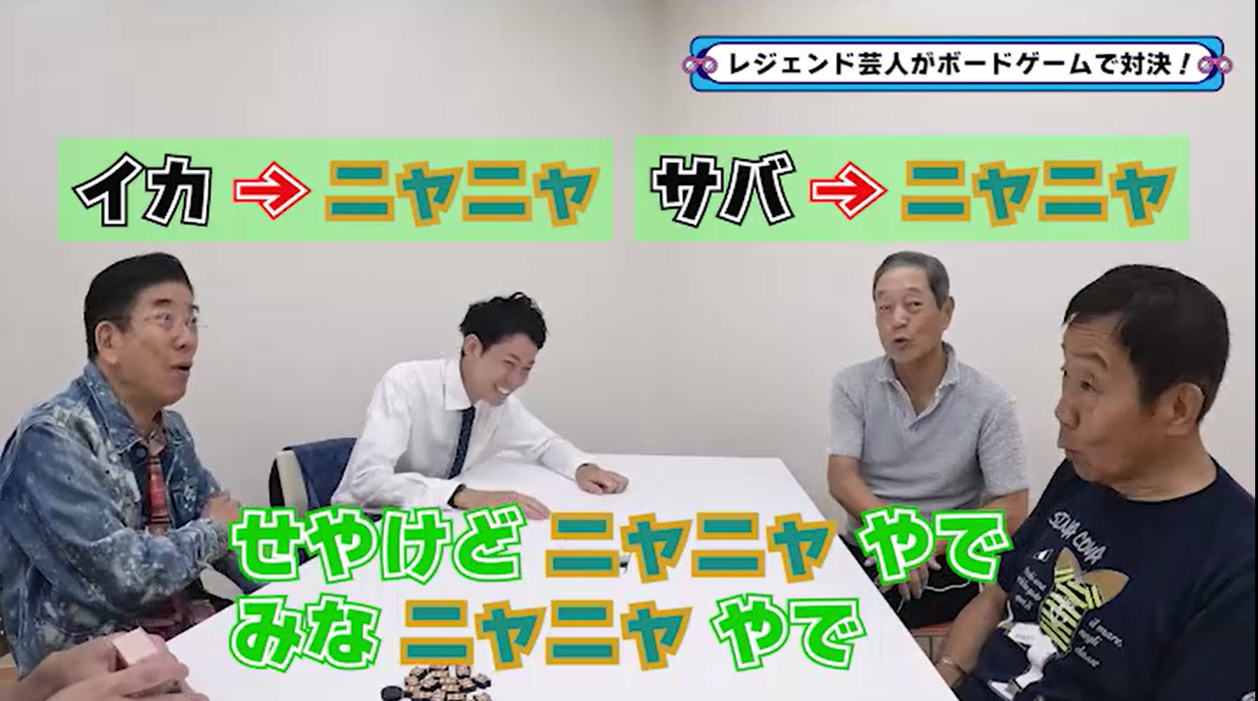 つづいて、「よしもとボードゲーム部」部長のOKI(ファンクラブにゃんちー)から、「ニャーニャーゲーム」を教わります。これは、猫語解読の協力ゲーム。猫役のプレイヤーは「ニャ」「ニャー」「ニャン」「ニャオ」など、猫っぽい音だけで言葉を周りに伝えるものです。