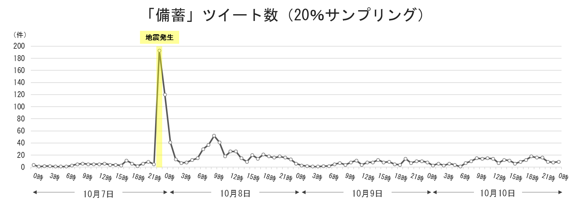 上記期間中、「地震」や「備蓄」とともに投稿された言葉の出現頻度をワードクラウド(※)にて表示(多くつぶやかれた言葉上位20までを選択)。また、「備蓄」について投稿された件数を1時間ごとに集計し、推移をグラフ化。