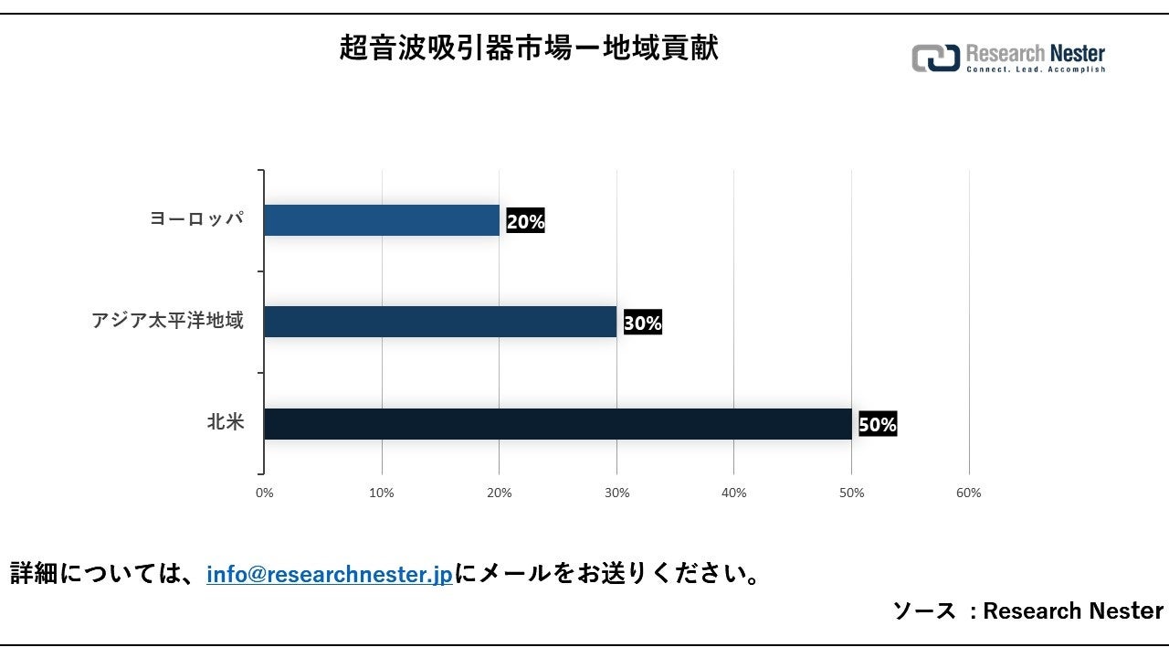 北米の超音波吸引器市場シェアは、他のすべての地域の市場の中でも最大となり、2035年末までに約37%のシェアを占めると予測されています。超音波吸引器市場の成長は主に、扁桃腺、鼻腔および副鼻腔内視鏡検査、鼻甲介手術などの耳鼻咽喉科関連の手術件数の増加と、実行される低侵襲および非侵襲的処置に対する需要の増加に起因すると考えられます。たとえば、米国では毎年 500,000人以上の子供が扁桃腺またはアデノイドを切除していると推定されています。 超音波吸引器は、高周波音波を使用して組織を破壊し、吸引によって組織を除去できるようにする装置です。侵襲性が最小限で、肥大した扁桃腺を迅速かつ安全に除去できるため、扁桃肥大の治療に最適なツールです。さらに、北米における可処分所得の増加により、患者はより良い医療サービスを受けられるようになり、その結果、超音波吸引器の需要が増加しました。
