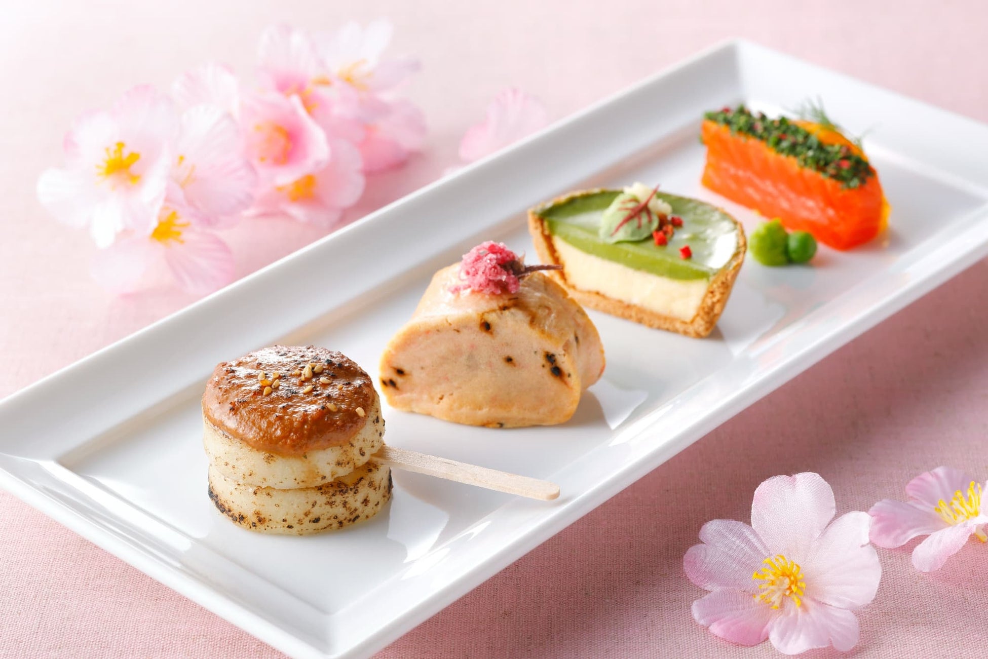 アフタヌーンティーの定番であるスコーンには、「桜と塩昆布のスコーン」をご用意いたします。生地に桜と塩昆布を練り込み焼き上げた、シェフオリジナルの一品です。その他、セイボリーには「お抹茶とカマンベールチーズのキッシュ」「サクラマスの柑橘マリネとグリンピースのピュレ」「芋餅と蕗味噌の五平餅風」の、3種の軽食をご用意いたします。シェフこだわりの和洋折衷なメニューをお楽しみください。