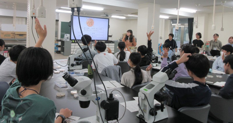 顕微鏡を使った実験では、参加者が、パン、納豆、味噌などに含まれる微生物のにおいを確認したり、肉眼では見えない微生物を大学生と一緒に楽しく観察していました。