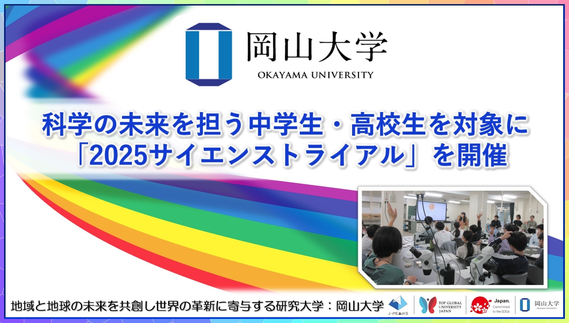 国立大学法人岡山大学(本部:岡山市北区、学長:那須保友)の岡山大学ダイバーシティ推進本部男女共同参画室は、2025年10月4日、最先端の研究の内容を実際に体験する「サイエンストライアル」を開催し、岡山県内外の中学生、高校生合計19人が参加しました。