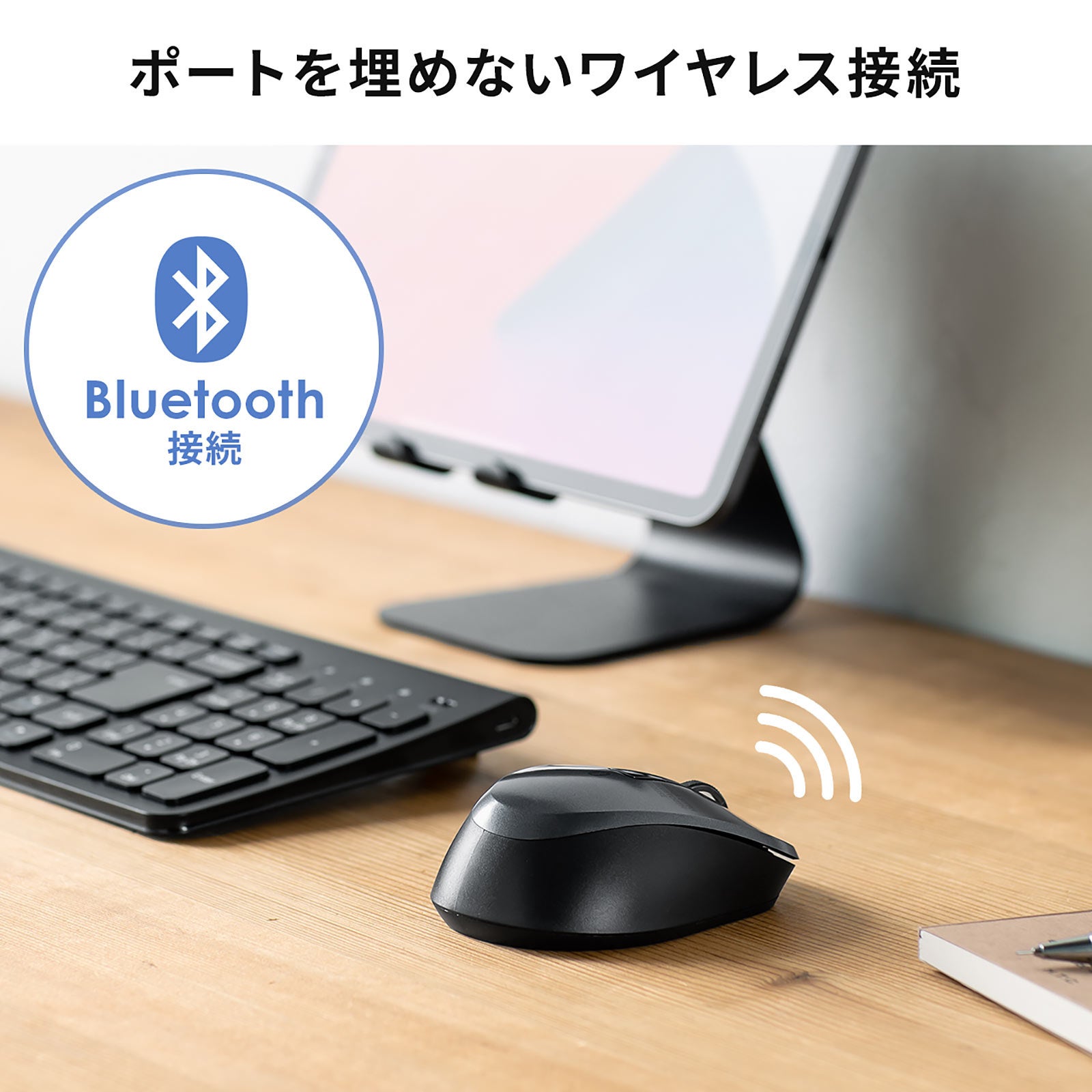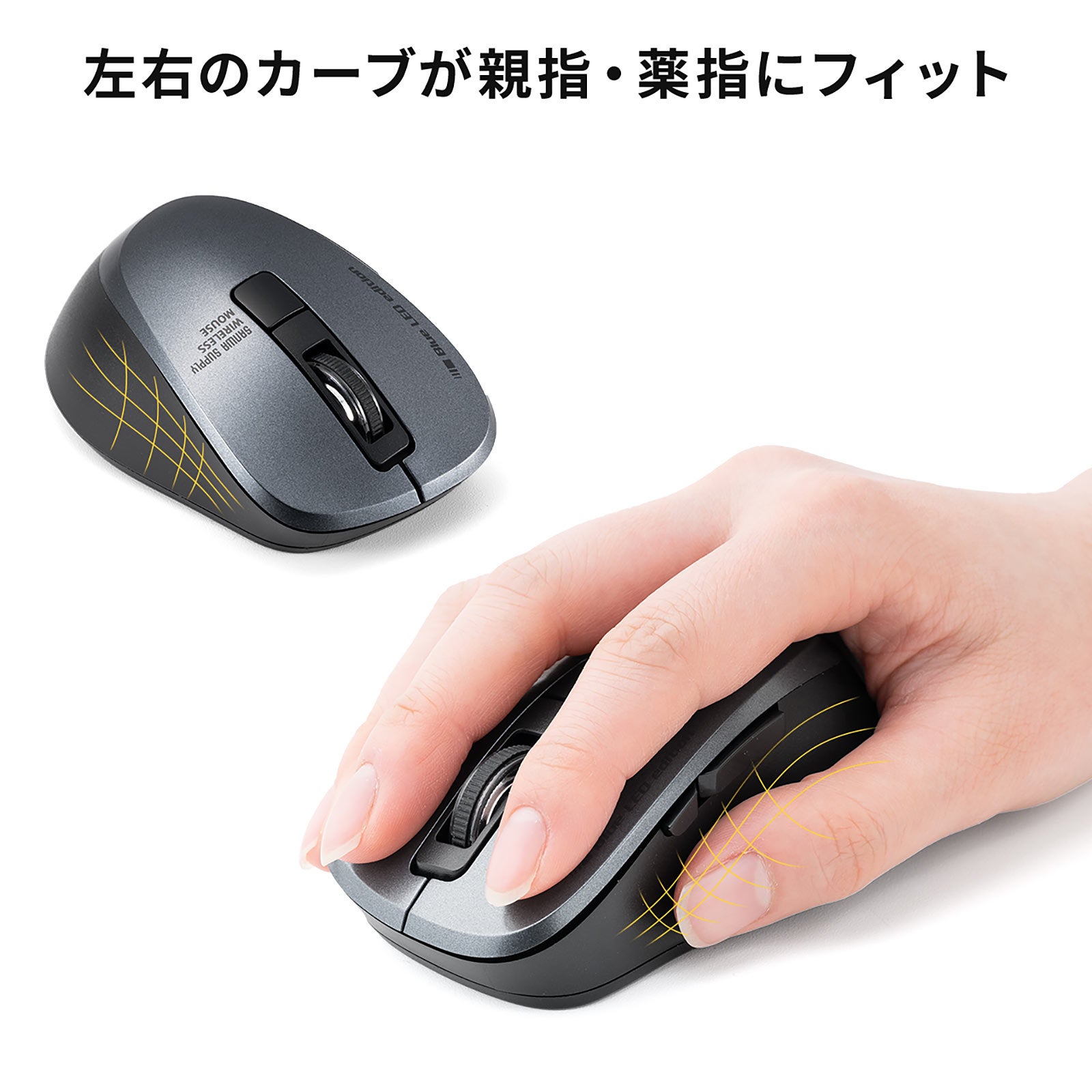 本製品は、コンパクトなボディに合計5つのボタンを搭載したBluetoothマウスです。立体的な側面形状が親指と薬指にフィットして、小型ながらも握りやすくなっています。