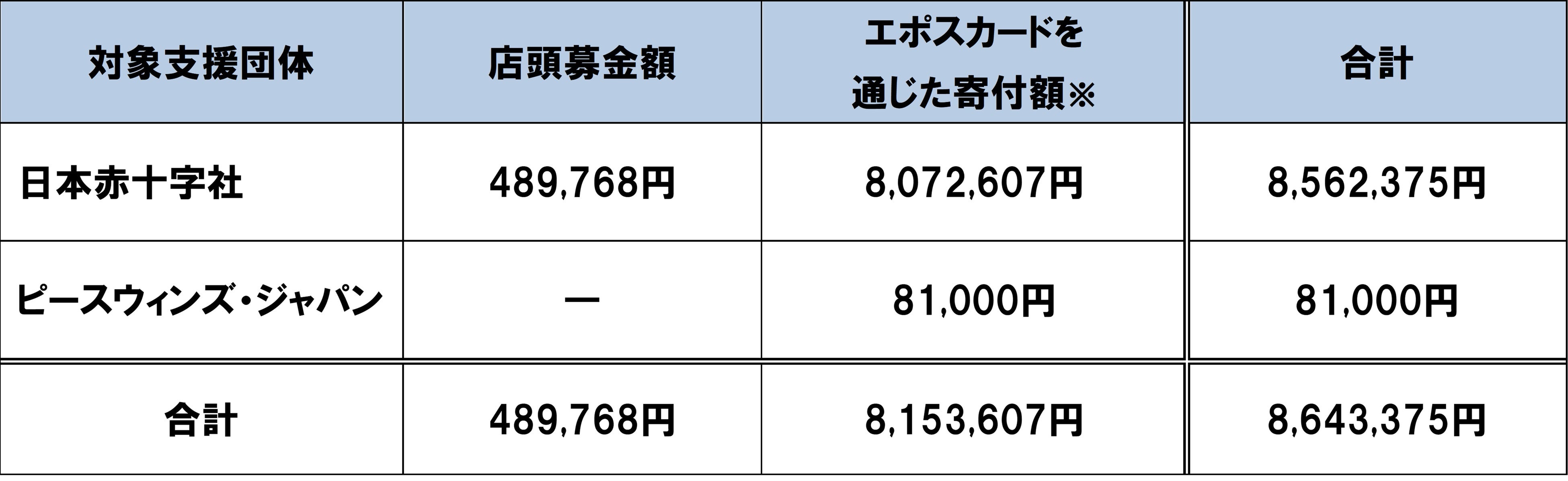 4月6日(土)より、エポスカードによる寄付のご案内とマルイ・モディ店頭での募金を実施し、4月30日(火)までに、お客さまから対象の支援団体へお寄せいただいた金額は約864万円※となりました。多くのお客さまからご協力いただき、誠にありがとうございました。