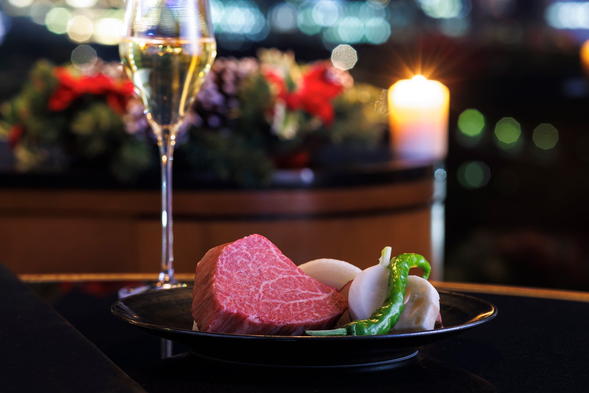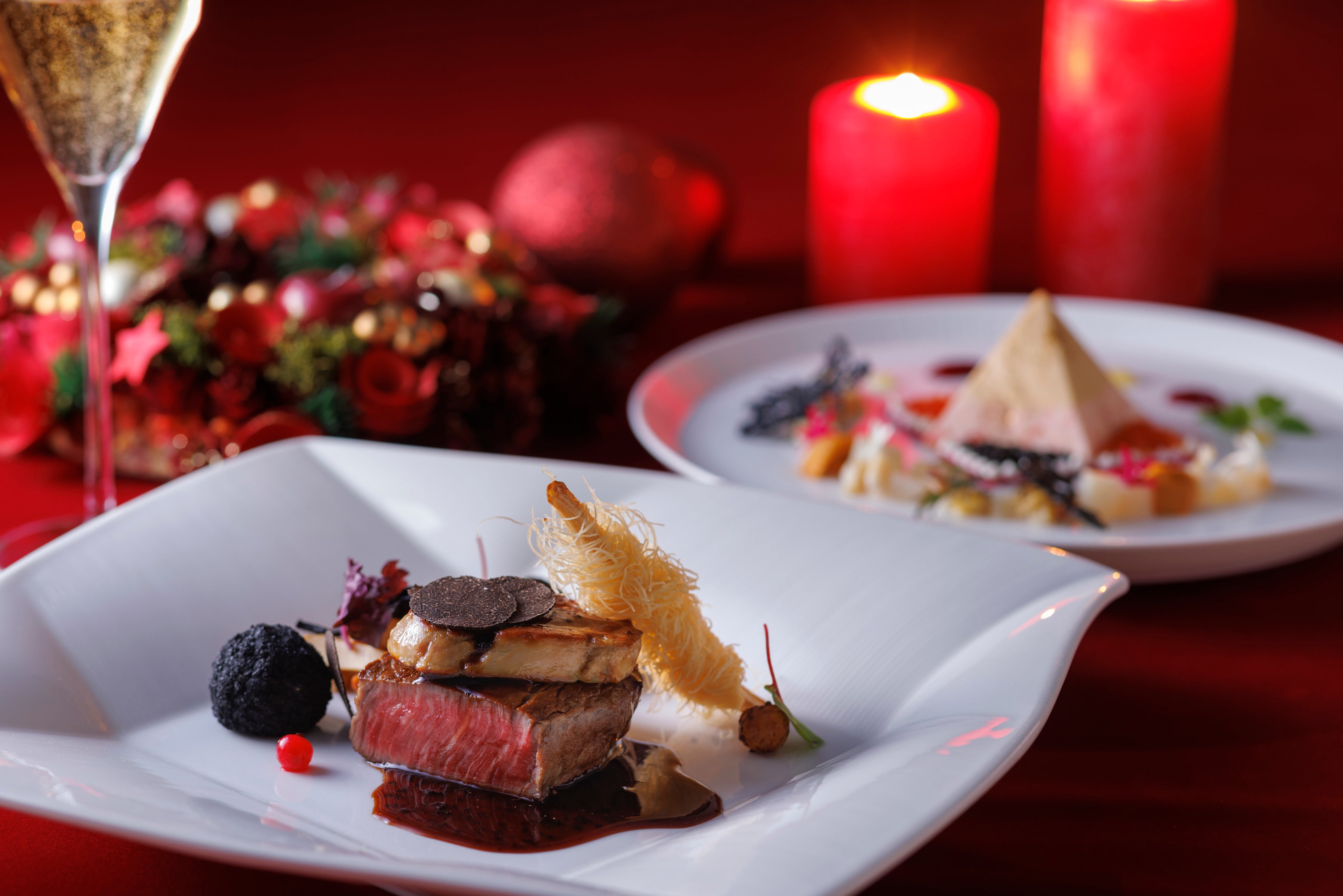 ホテル最上階に位置するフランス料理「SAKURA」の扉を開けた瞬間から広がるのは、気品あふれるインテリアとテーブルを照らす柔らかな光が当たり、窓の外にはクリスマスを祝うにふさわしい華麗な夜景がまるで一枚の絵画のように広がります。そのような空間でいただけるのは、舌平目のムースを纏ったメダイヨンとオマール海老をシャンパンとアメリケーヌのリッチなソースで贅沢に仕上げた「舌平目のムース詰め メダイヨンとオマール海老シャンパンとアメリケーヌソース 珠玉のエマルジョン」や、熊本県産黒毛和種“和王”のフィレ肉に、濃厚なフォアグラを重ね、薫り高いフランス産黒トリュフを散りばめた至極のソース・ペリグーで仕上げた「熊本県産黒毛和種"和王"フィレ肉とフォアグラのロッシーニ仕立て 薫り高いフランス産黒トリュフを散りばめた至極のソースペリグー」などをご用意。豊富なワインとともに、至福の料理とワインとのマリアージュをお愉しみください。